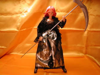 | 七体目のオリジナルドール「姉小路 苺」(あねこうじ いちご)です。 彩狐の関係者って設定です。 コンセプトは彩狐よりもヤバく、変な髪形の悪役ヅラ(^^; メッシュを入れようと増毛したのですが・・・・ ちょっと失敗気味でした(;_;) アイペイントをリキテックスでやってみました。 ガッシュより伸びますね、コレ♪ 初めてアイペイントしてみようって方には、 一番使い易いかも。 道明寺にしては珍しく、設定と役割が先に決まっていたキャラです。(普段は作ってから決めてます) 着ているドレスは「ドルパ5」で購入しました。 ・・・・が、サークルさんの名前がわかりません。 ↑またかよ!(^^; エナメルと蛇皮調のコントラストがハードで気に入ってマス♪ ウチにはこのドレスが似合いそうなキャラがいなかったので ドレスに合わせてキャラを立てた感じですネ(^^; 手に持ってるのは、「ララ」から拝借した鎌です。 アゾンさんの「死神の鎌」の方が良かったカモ・・・(^^; |
