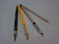 デザインナイフ。 多くのメーカーから、色々なサイズが出ています。 替刃が手に入りやすいモノを選んだ方が良いでしょう。 |