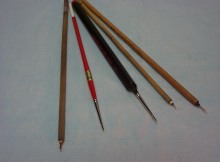 筆。 道明寺は模型店で買った、プラモ用の面相筆を多用します。 最近は、ドール専用の筆も売ってます。(真ん中の変なカタチのやつ) 高価なモノで無くてかまいません。 3〜600円位かな? ただし、穂先の揃っているモノを選んでください。 |