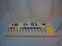 塗料。 写真は、ホルベイン社のアクリラ・ガッシュ。 他のメーカーでも、ガッシュ系のアクリル絵の具なら大して違わないハズ。 大型画材店で売ってます。 別に、プラモデル用の塗料(以後、プラカラー)でもかまいません。 その場合は、アクリル塗料がいいでしょう。水で洗えます。 |