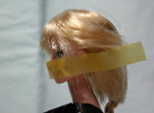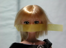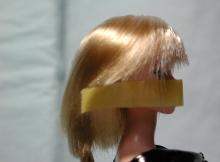 | 使用するドールヘッドが、同じメーカーのモノだと非常に有効です。 マスキングテープを、両目の下端に合わせて真っ直ぐ貼ります。 (この作業の前に、テープを一回手の甲にでも貼って粘着力を弱めておくと、髪がくっつき難くなります。) |