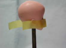 | テープを真っ直ぐに、ぐるっと反対側の耳まで回します。 ここも、いっしょです。位置を確認してください。 テープを貼り終わったら、ドールとよく見比べてください。 左右とも、同じ位置にテープが貼られていればOK。 違っていたら、同じになるまで貼り直しましょう。 焦りは禁物です。 |