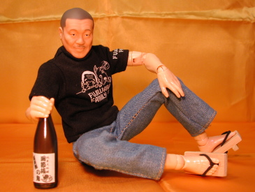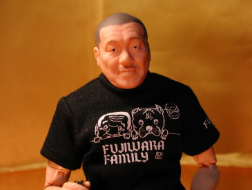 | インスパイア製「藤原 喜明」フィギュアです。 モデルになった人物を知らない方も多いと思いますので、少々説明をば・・・ この藤原さんのお仕事はプロレスラーです。 得意技はサブミッション(関節技)と頭突き。 若い時は前座試合で玄人好みの渋いプロレスをしていました。(当時、関節技は殆ど認知されていなかったのです) その後、「総合格闘技」路線のUWFと言う団体で真価を発揮、「関節技の鬼」と呼ばれました。 現在の関節技主流のレスリングの基礎を作った一人と言っても良いでしょう。 自分の団体(藤原組)を持った事もありましたが現在はフリー、プロレスだけでなく役者としても活躍中。そんな彼をファンは愛情を込めて「組長」と呼んでます(^^ 結構器用な人で板前の免許を持っていたり、イラストを描いたりもしています(画像のTシャツは組長直筆の物を縮小した物)。 はあ〜、やっとドールについてですね(^^; デフォルトの状態ではTシャツにレスリングパンツ&シューズでしたが、Gパンを穿かせて下駄を作ってあげました。←こっちの方が「らしい」でしょ?(^^; ボディはボークスのNEO・GUYに換えてます。 手にもっている一升瓶は付属してました。 中身はスポーツドリンクだそうです(爆) |