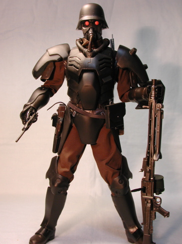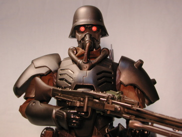 | メディコム・トイの「人狼/プロテクト・ギア」です。 私、この映画を観てないのですが(笑)、 「紅い眼鏡」から続く無骨なデザインに惚れました。 設定では「機動隊員」だとか・・・ 「S・A・T隊員」と比べると凶悪なまでに 頼もしいです・・・ こんなのが夜道に居たら泣きますね、絶対(笑) このフィギュア、と〜ってもカッコイイのですが、 残念な事に装備品が外せません。 ↑全て接着されてるんですぅ〜(;_;) オマケに使用している素体は「ニューコンバットジョー」。 可動範囲が少ないです(TT) 御覧の画像の物は、少々手を入れてます。 手の部分がソフビ製で銃器の保持が出来ないので、 別のフィギュアから移植した腕を付けました。 それから右腰のホルスターも 一体成型でしたので、一旦切り落としてから イエローサブマリンのモーゼルミリタリーに 変更してます。 それに合わせてベルトに弾装パウチを追加しました。 もう一つ・・・ 付属のMG-42(機関銃ね)の出来が アレ(笑)でしたので、ドラゴン社の物と換えました。 このモデルは「ドール」として見ると 不満な箇所が多くありますが、 本来は観賞用フィギュアなんですよね(^^; そういった見方をすれば、良い出来だと思います。 |