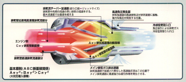 具体的には、排気圧力でベンチュリー効果により負圧を生み出して排気ガスを吸引し、エンジンシリンダー内の掃気効率を高める装置を排気管の末端に装着します。