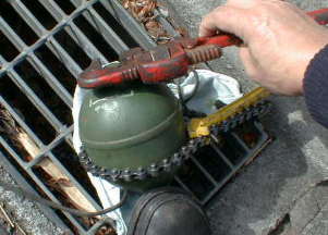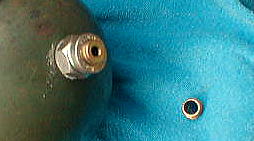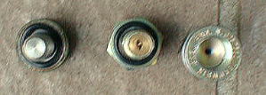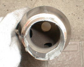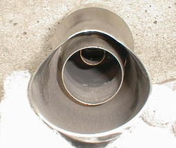 | エンジン側の排気入口です。コーン部のセンターの穴に排気が絞られて高速流となります。コーン部の側壁には4個所の排気吸引バイパス用の穴が見えます。 | 排気先端からの写真です。真中の小径管からコーン部で加速された排気が噴出し、中径パイプ内に負圧が生じてバイパス穴から排気を吸引加速します。 |