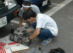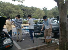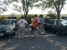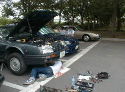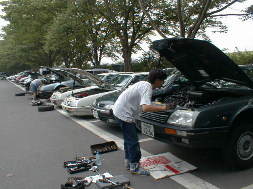 参加車のエンジンが冷えるのを待つ間、木陰では情報交換やベルト交換等の軽作業が行われました。