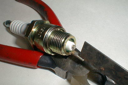 製作方法は写真の様に、接地電極をプラグ・ギャップゲージのギャップ調整部を使って起し、今回は金鋸の歯で1mm幅の溝を切りました。