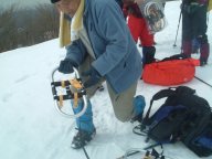 ![]() 雪も深くなってきたし 郭公さんとmilioさんがワカンを装着。 装着にちょと悪戦気味。 |