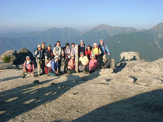 ![]() 食後は、さすがに皆疲れているのか、8時の消灯前に既に眠りに入っている様子。 4時半起床 5時半朝食 5時45分出発 今日は、昨日よりさらに天気は良く、真っ青な空に昨日は頭を隠していた北岳もくっきり。 薬師岳山頂は広い台地状。 皆で記念写真をとって、観音岳へ向け出発。 |