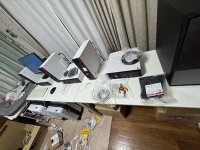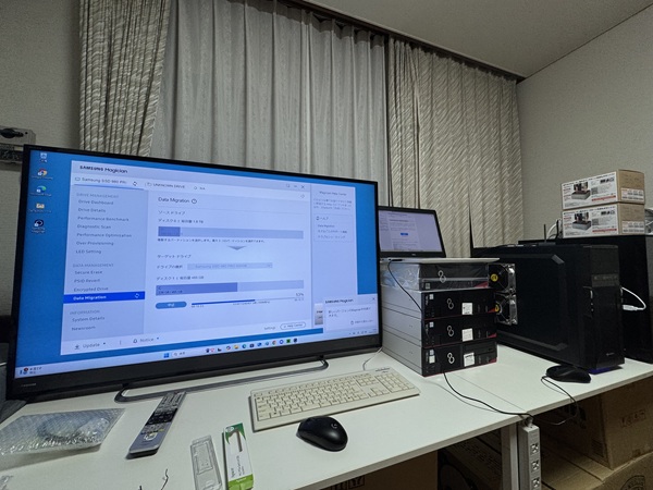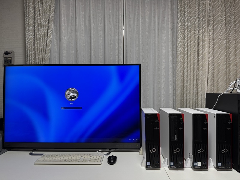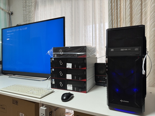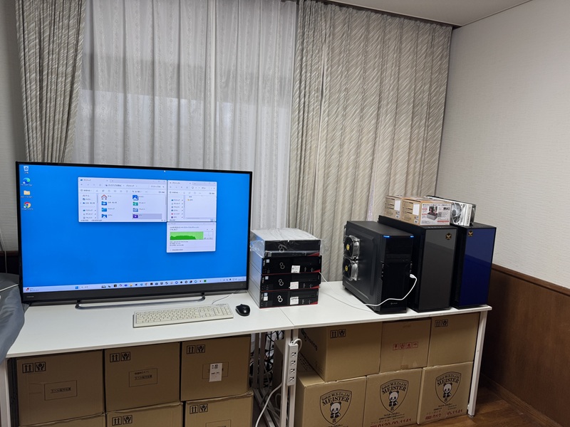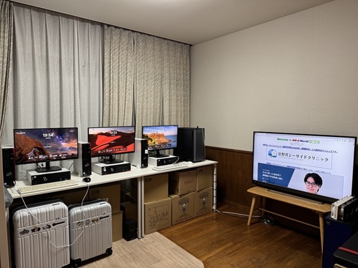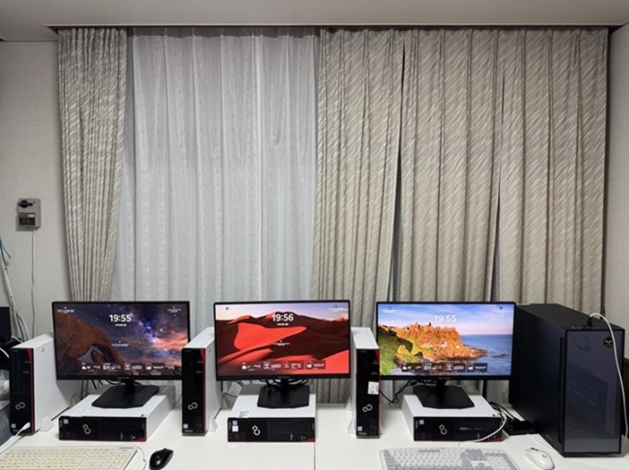 | スリムデスクトップPCを6台とミドルサイズPC1台を設置して大型モニターはサイドに移動です。 | 作業風景です。 | ||