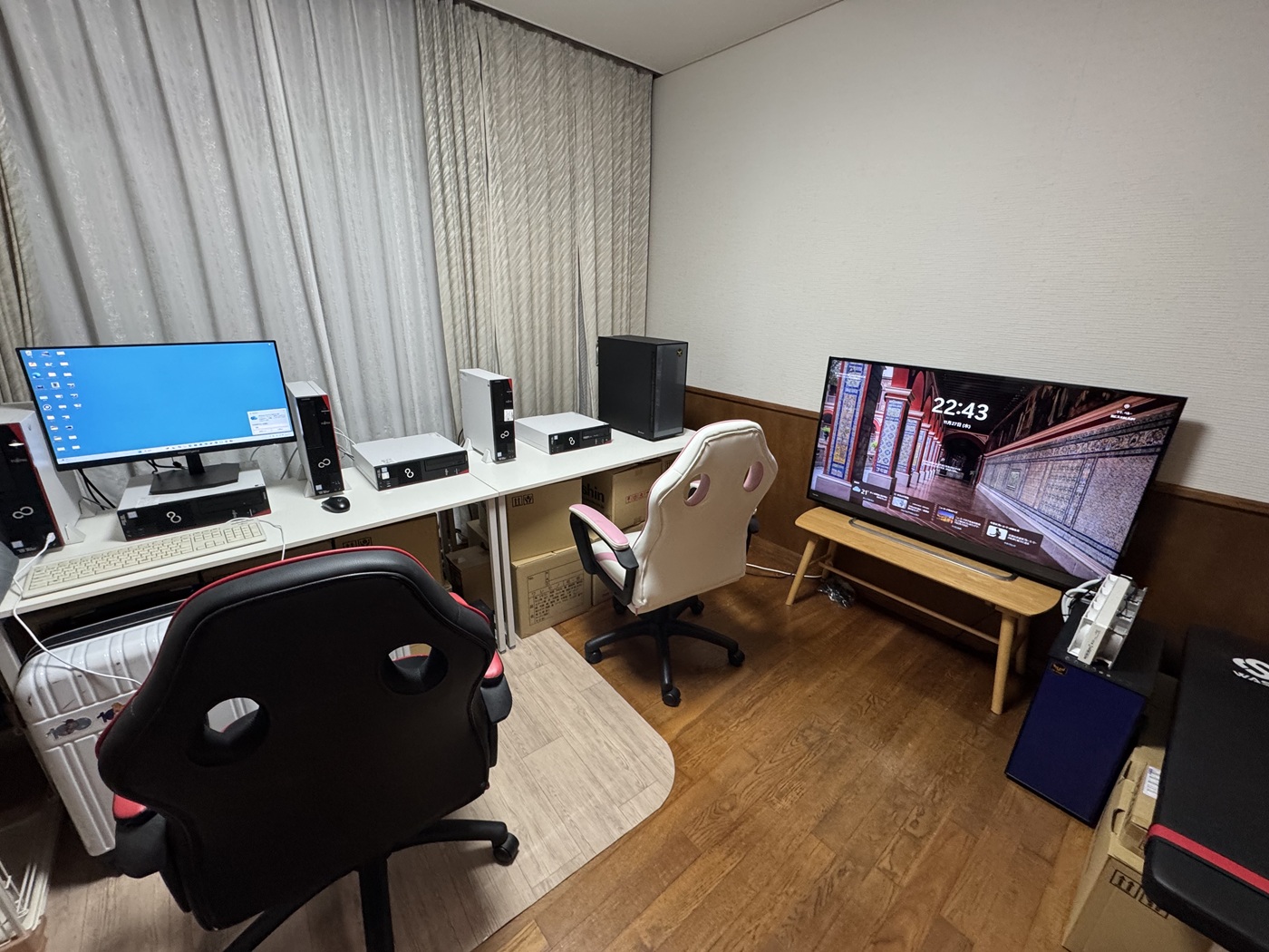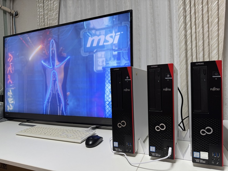 スリムPC3台と大型モニター1台の合計4台でで4人同時プレイ可能です💦 ※いや、2階のPCルームを片付けてPCいじりを3階で行なう為の作業です。 横置きがBMOオリジナル富士通ESPRIMOスリムデスクトップ改ゲーミングPCです。 縦置きはゲーミング仕様ではない富士通製 ESPRIMOスリムデスクトップ改PCです。 |