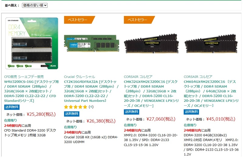 8GB以下は在庫無しで、16GB x2 32GBが¥2,5万円オーバーです💦