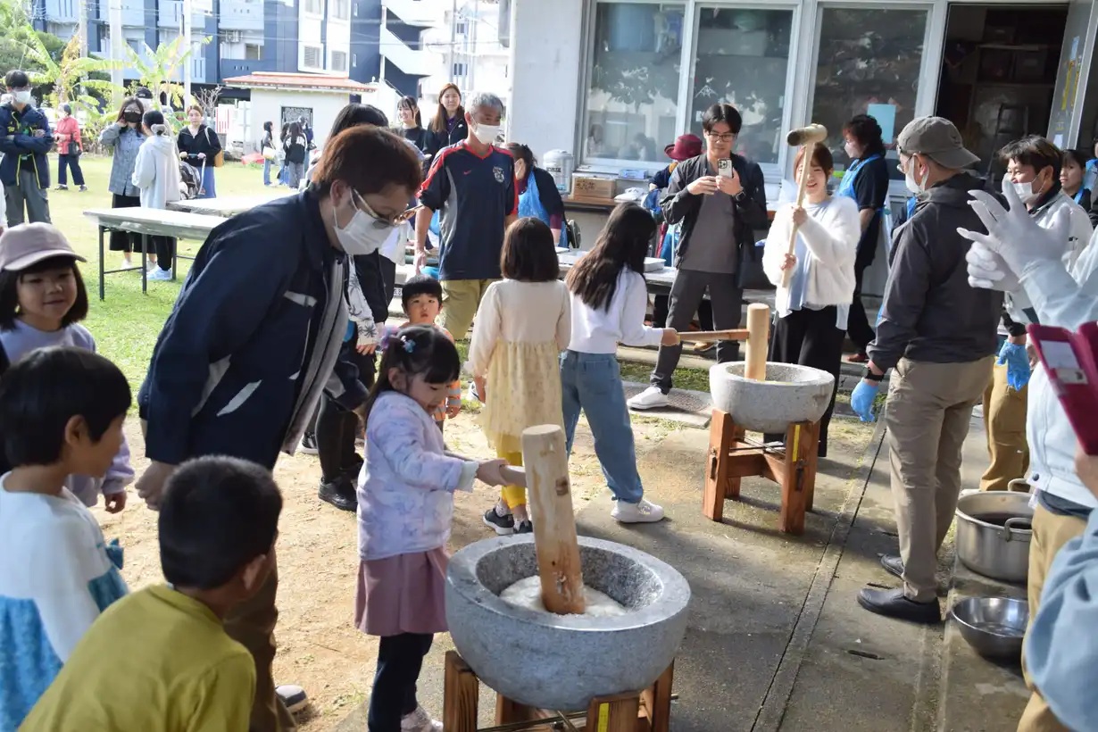 ローカル紙(琉球新報)紙面の餅つき画像です。 (2026 1/12 伊佐公民館)