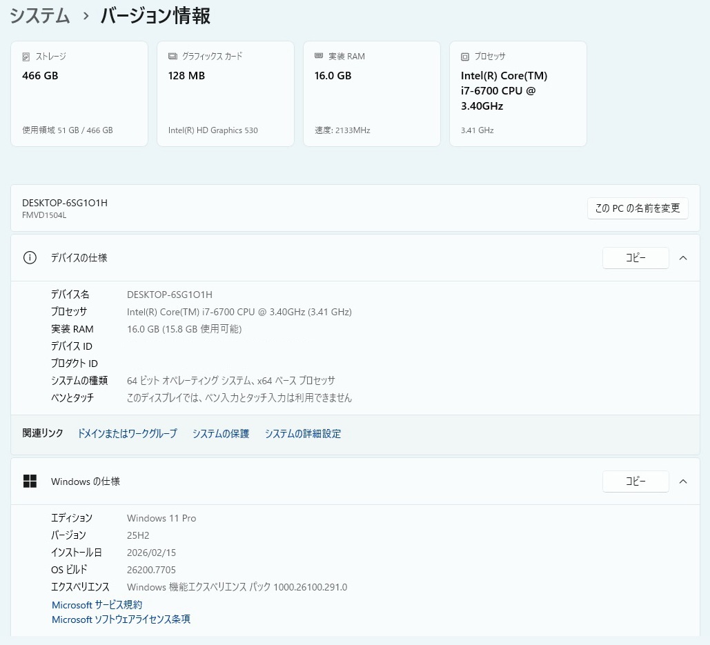 CPUをi7-6700に換装してWindows11Pro 最新バージョン25H2をインストールしました。