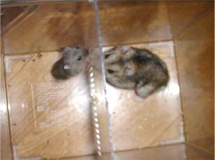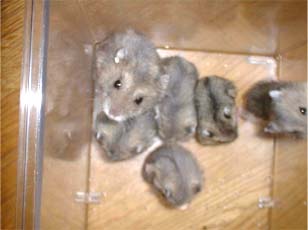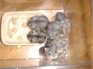 ケージの掃除中、別荘に入ってもらった。 1匹だけママの下。 |