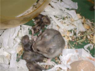12日目。母子勢ぞろい! めるの食べたえさのかけらを拾って 食べ始めました。 |