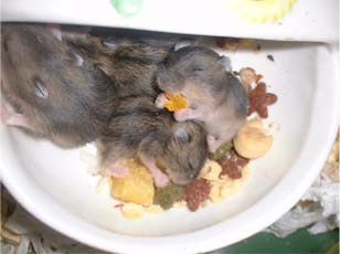 母乳だけではなく、やわらかい餌も 食べるように なりました。 落ちているのを拾って食べている 状態だったので、 えさ皿にまとめて入れてみました。 |
