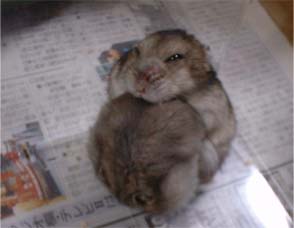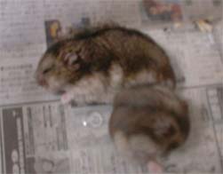 交尾が終わってむーぐったりの図です。 めるは必死に自分をなめてます。 この後、めるは急にむーや私に対して 攻撃的になったので、この日のうちに 別居させたので、生まれた子供はこの写真の 時にできた子供だと思われます。 |