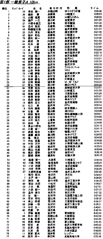 | 辰口クラブB | 田中 利明 12'10 | 西田 明洋 12'57 25'07 | 前 良紀 13'21 38'28 | 米沢 幸広 12'30 50'58 | 15)50'58 | 陸連登録の部 |