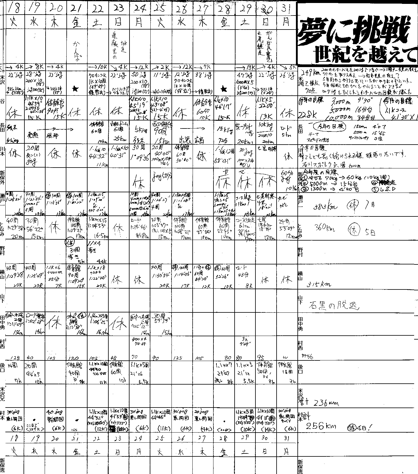 | 村本 | 3.6k: 11'40 3.9k: 12'56 | 1: 3'07.3 | 200×3 :36,35,34 400×10 :76,75,75,74,,,,68.6 | ||