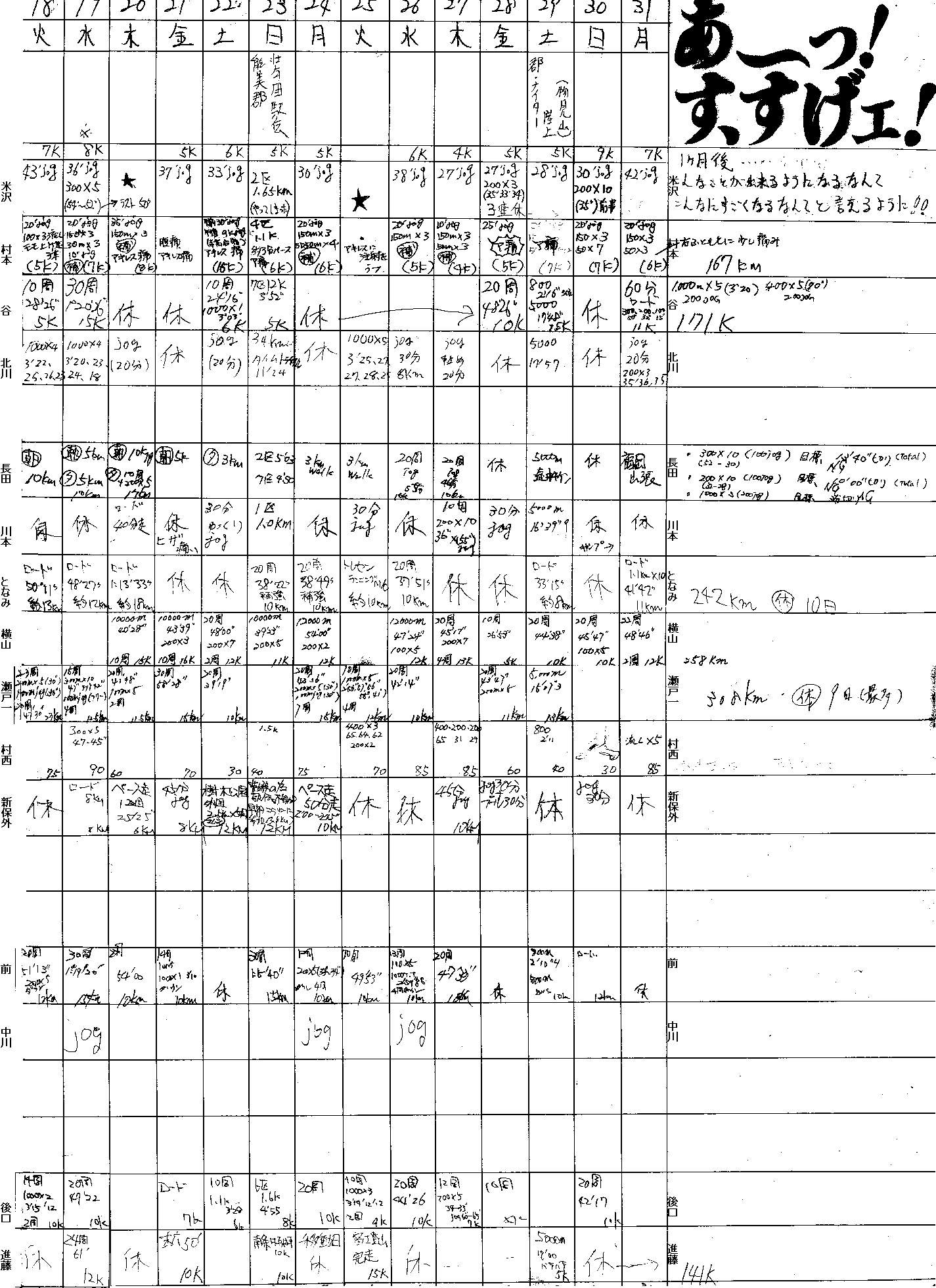| 順位 | 選手 | 練習量 | 日平均 | 20km以上 | 備考 |