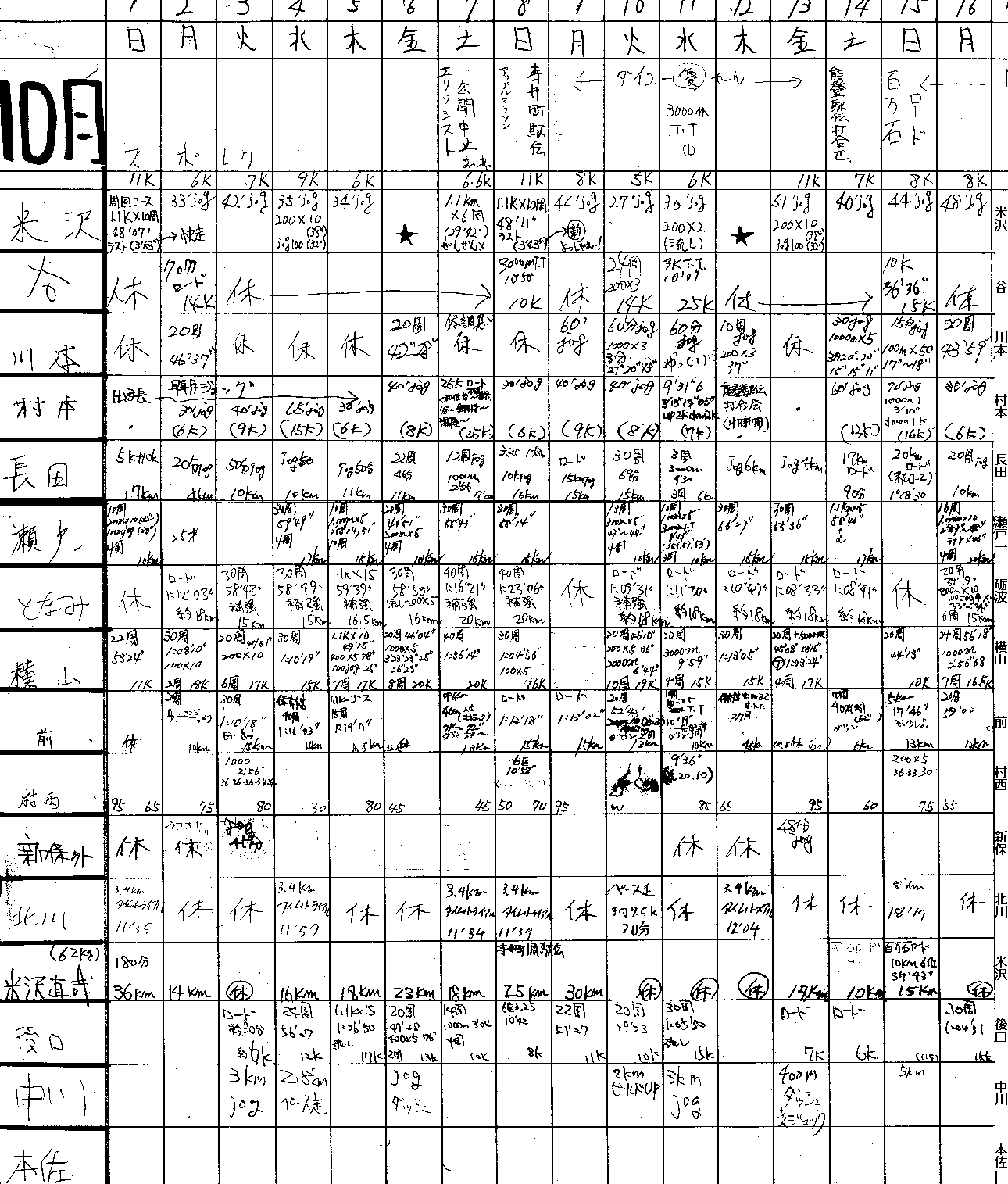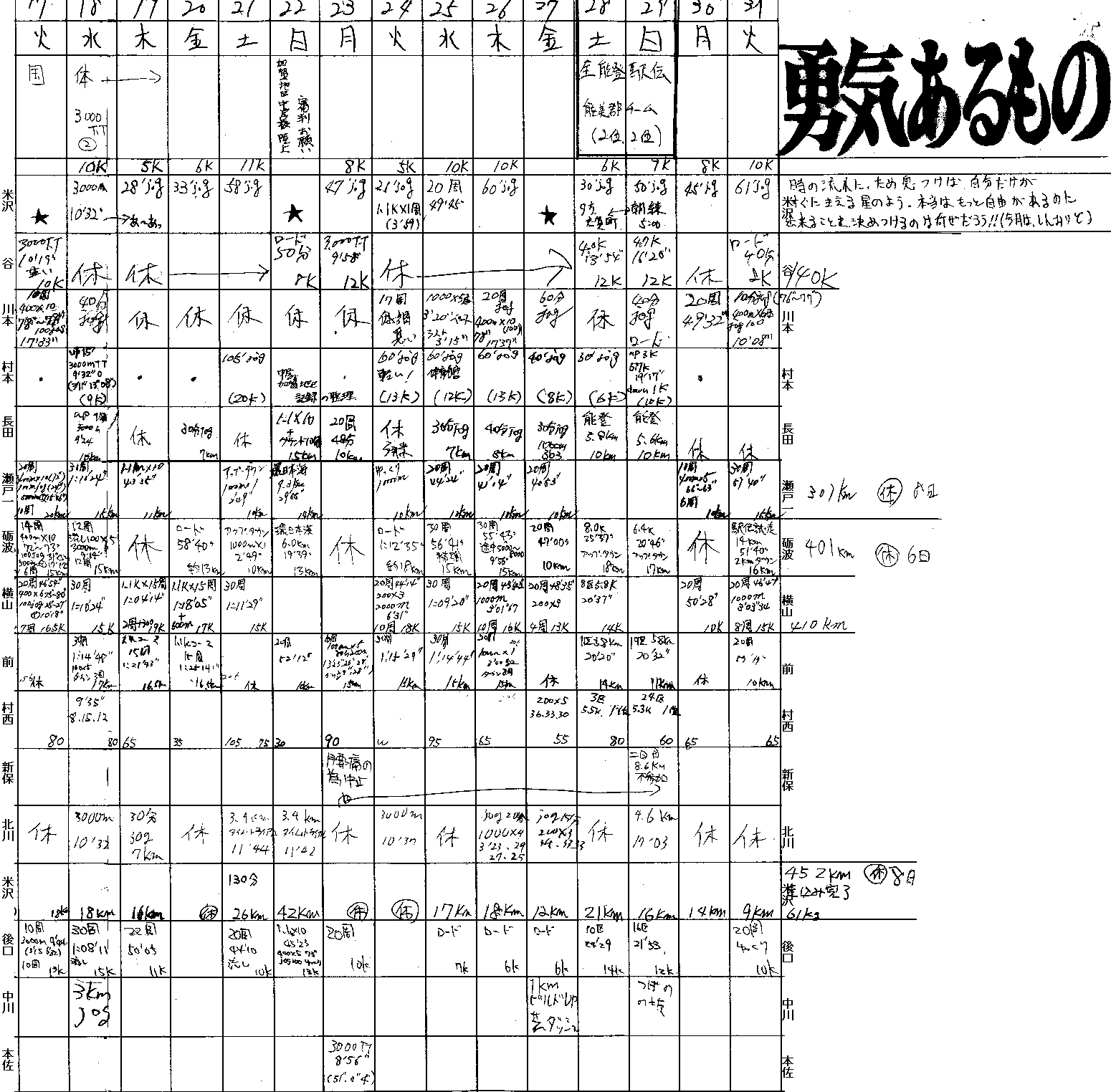 | 米沢直哉 (62kg) | 10k 37'43 | 452km走りこみ完了 61kg 休8日 |
