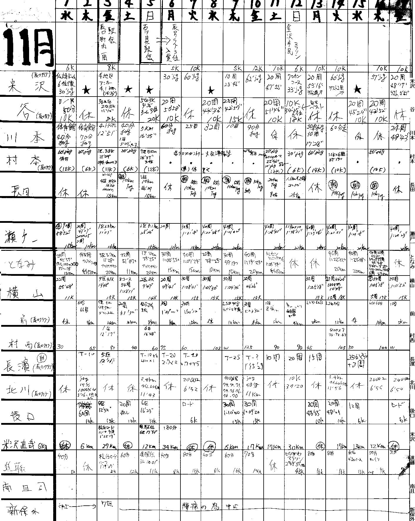 | 順位 | 練習量 | 日平均 | 20km以上 | 備考 | |
