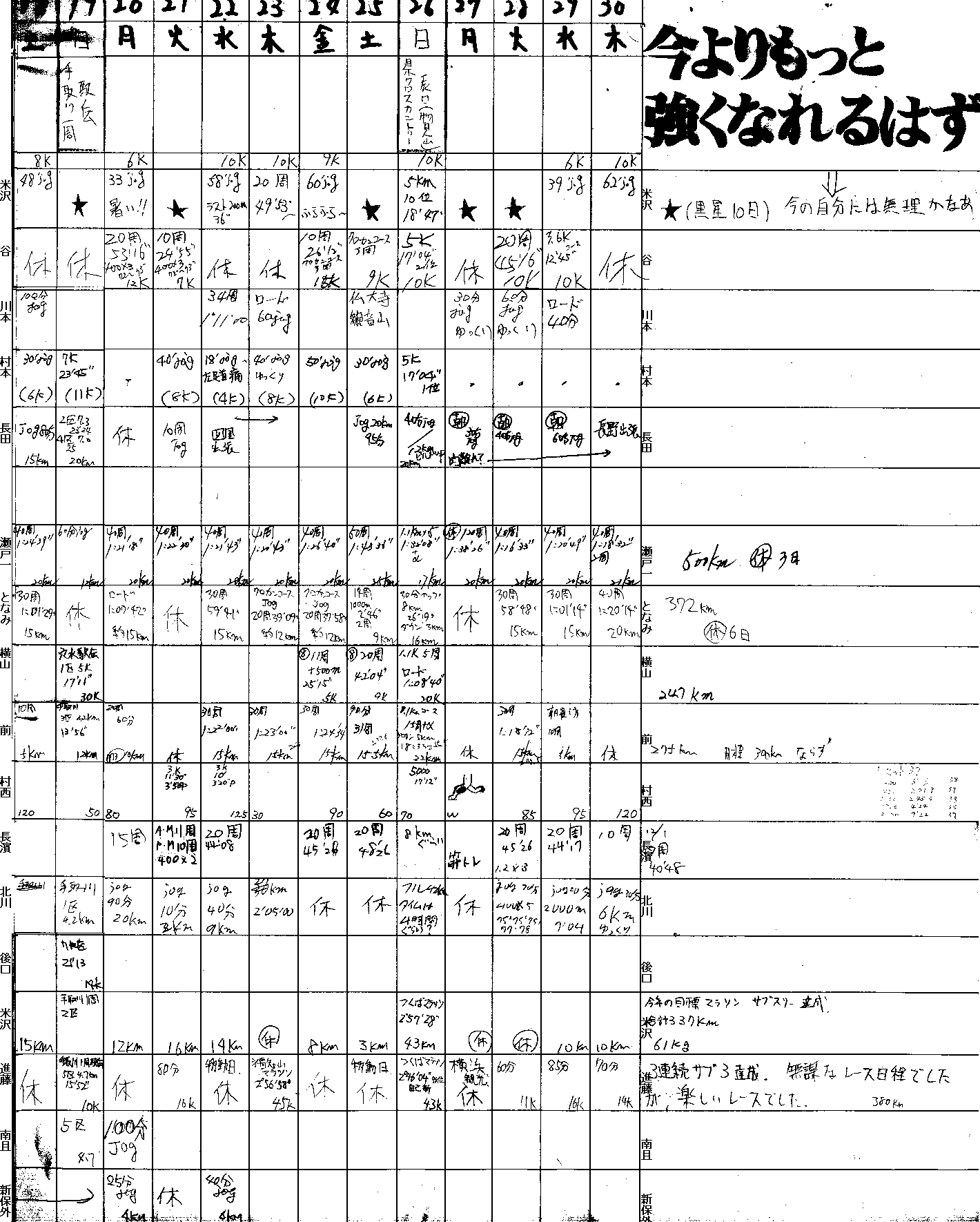 | 米沢直哉 (61kg) | ハーフ 1:22'19 5.0 1743 7.3 2527 マラソン2:5728 | 337km 61.0kg | ||||