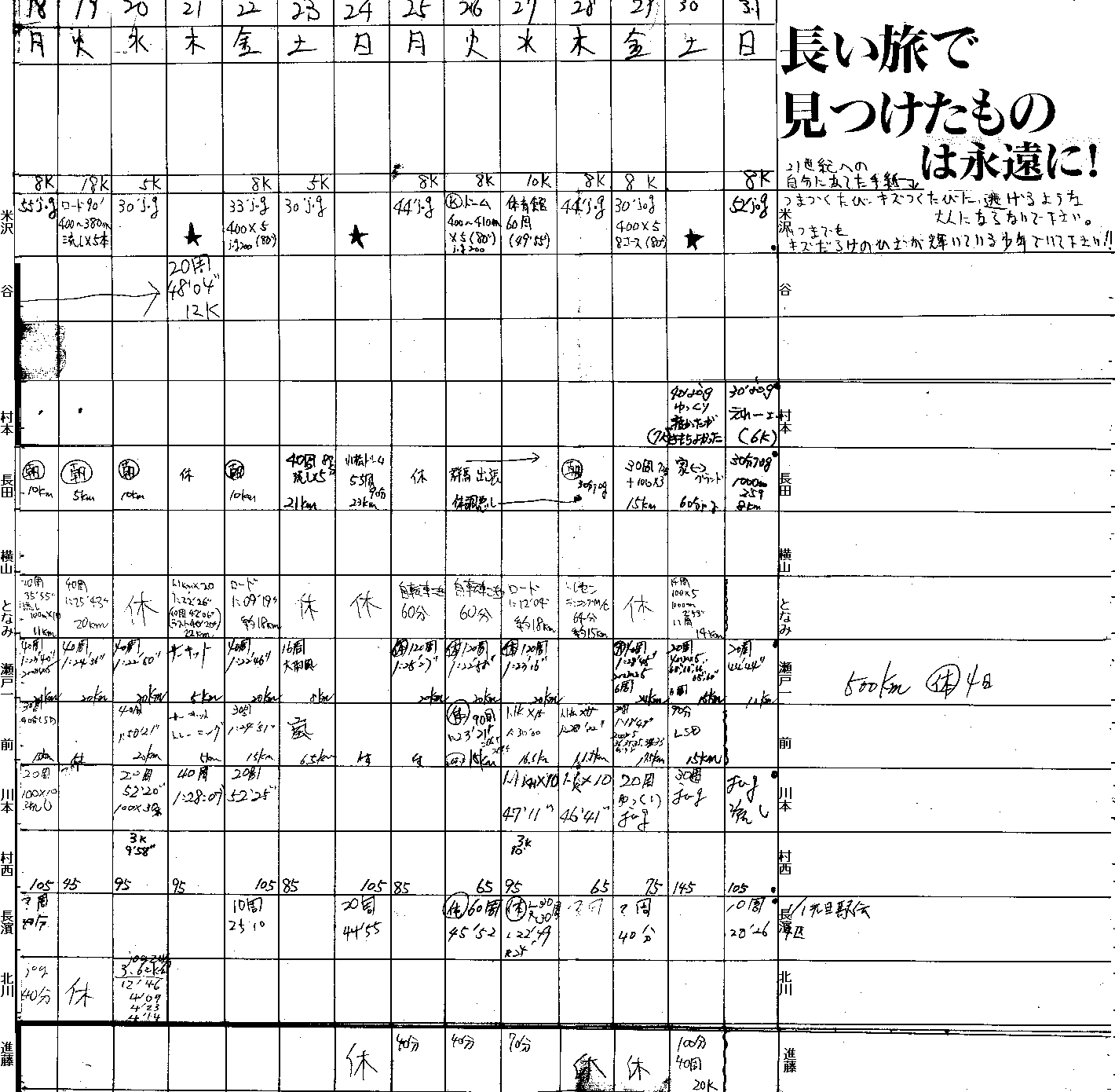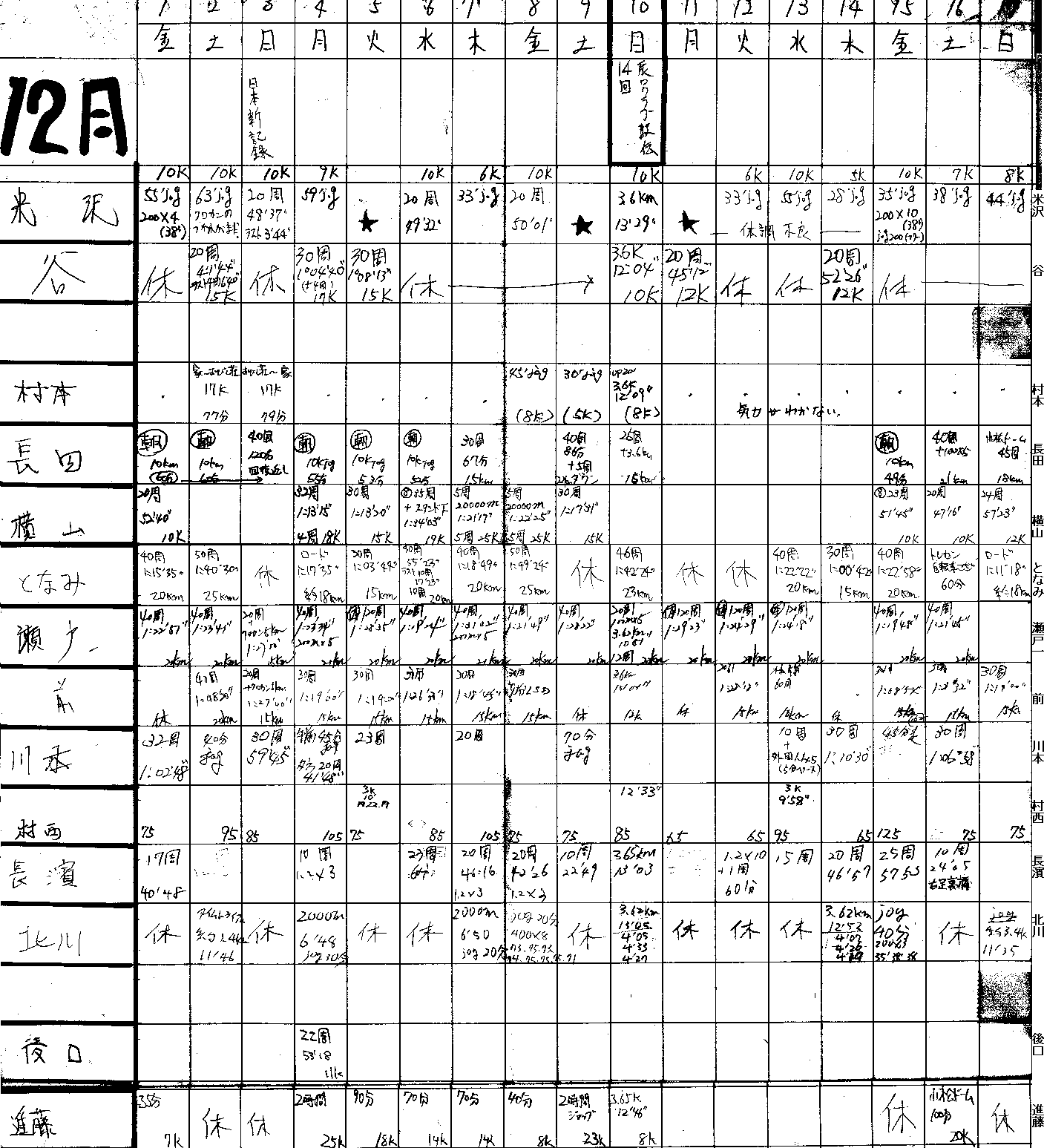| 順位 | 練習量 | 日平均 | 20km以上 | 備考 | |