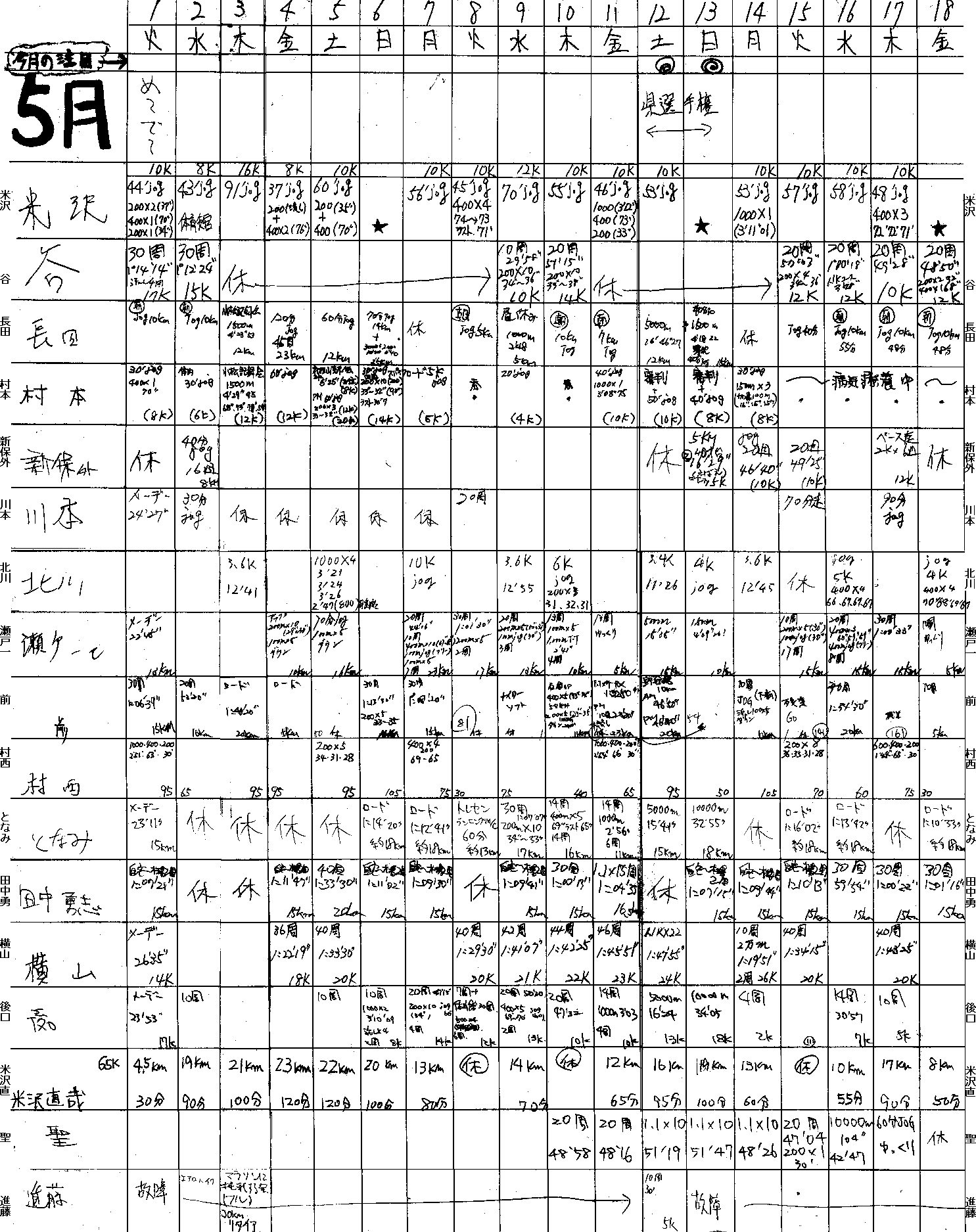 | 北川 | 5 19'11.62 8 2'13.18 10k 3957 | 1 3'03 | 200*3 31-32 400*4 66-67 400*4 70-68 400*4 69-64 | 1*3 800 3'21,24,26,2'47 | |