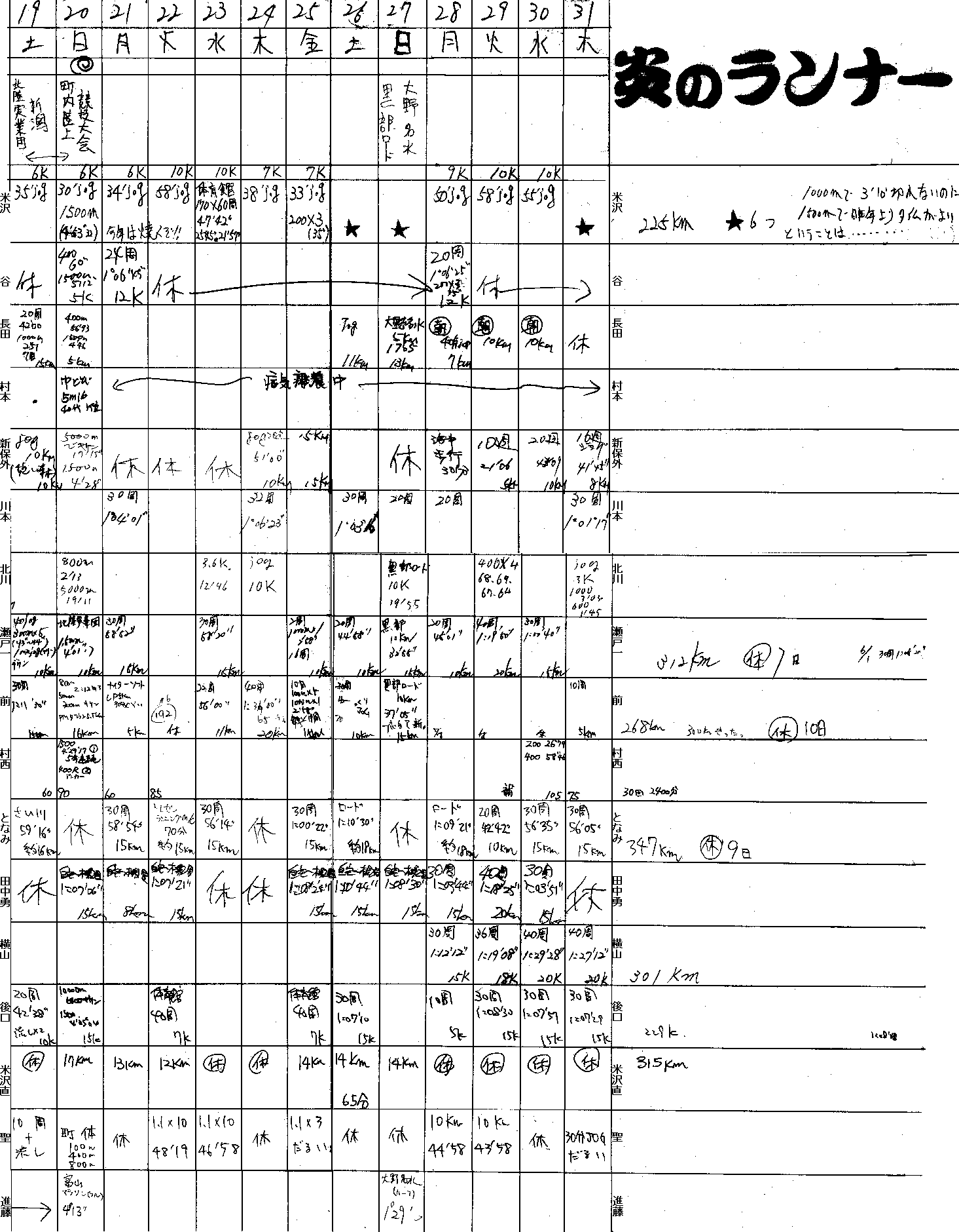 | 瀬戸一 | 7.4 2245 5 15'35.34 15予4'09.67 15 4'09.24 15 4'01.17 10k 32.55 | 1 2'41 1 2'58 | 200*10 29-30 200*5 30-31 200*5 30 300*5 43-44 400*10 67-68 400*3 60-59 | 312km 休7日 | |