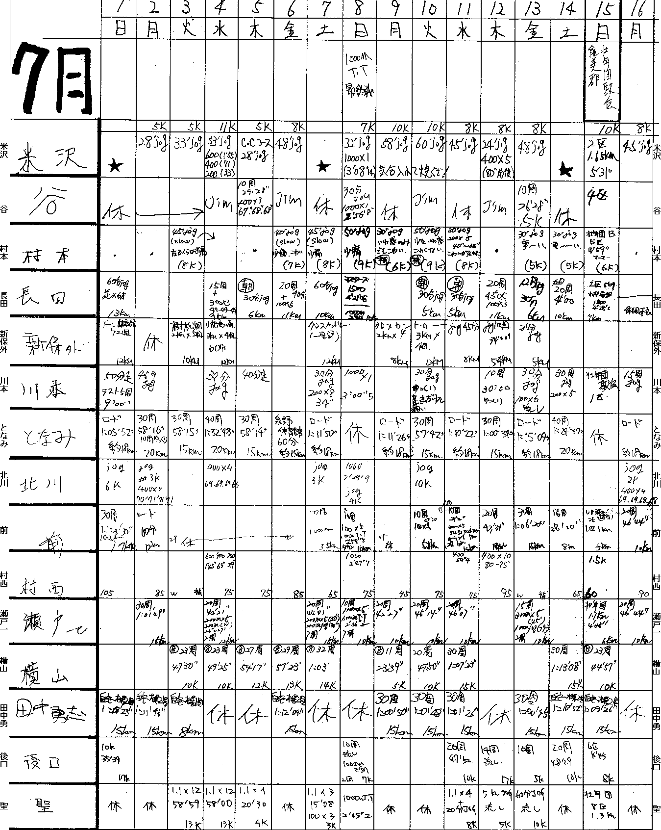 | 順位 | 選手 | 練習量 | 日平均 | 20km以上 | 備考 |