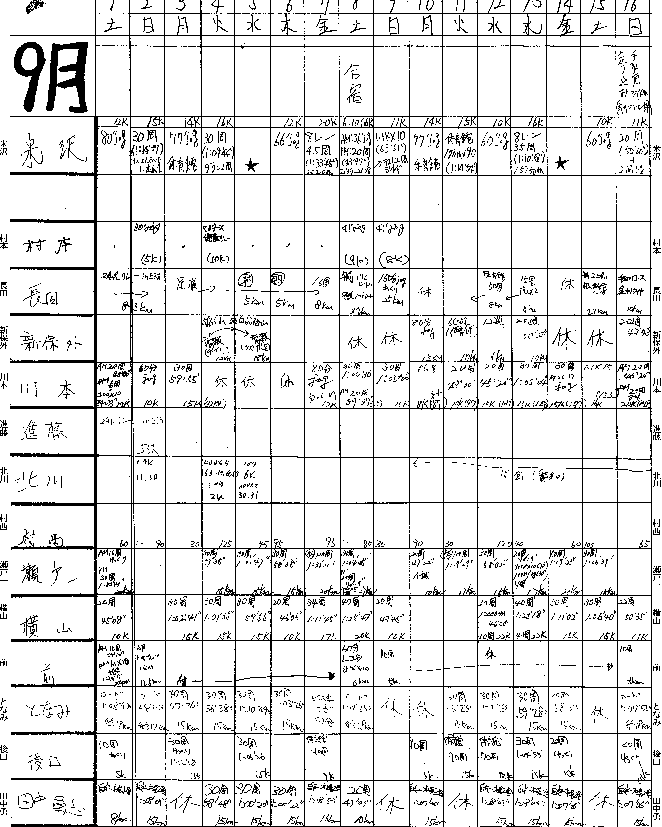| 堂谷 | 20 73'55 | 1000*5 3'10,12,14,15,11平均3'12.4 | 3+2+1