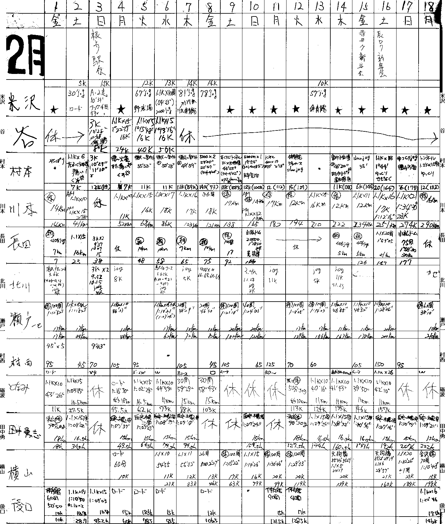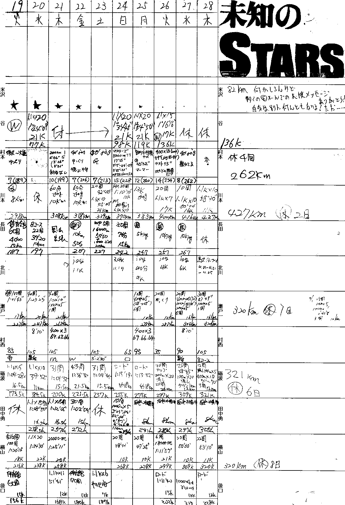 | 村本 | 2.95 1027 2.95 1111 5 17'15.4 | 5 1924 2 646 | 400*10 78 400*15 79 | 5*2 2300 2047 | 262km 休み4日 | |