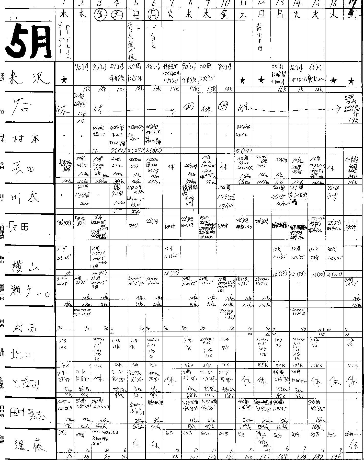 | 順位 | 選手 | 練習量 | 日平均 | 20km以上 | 備考 |