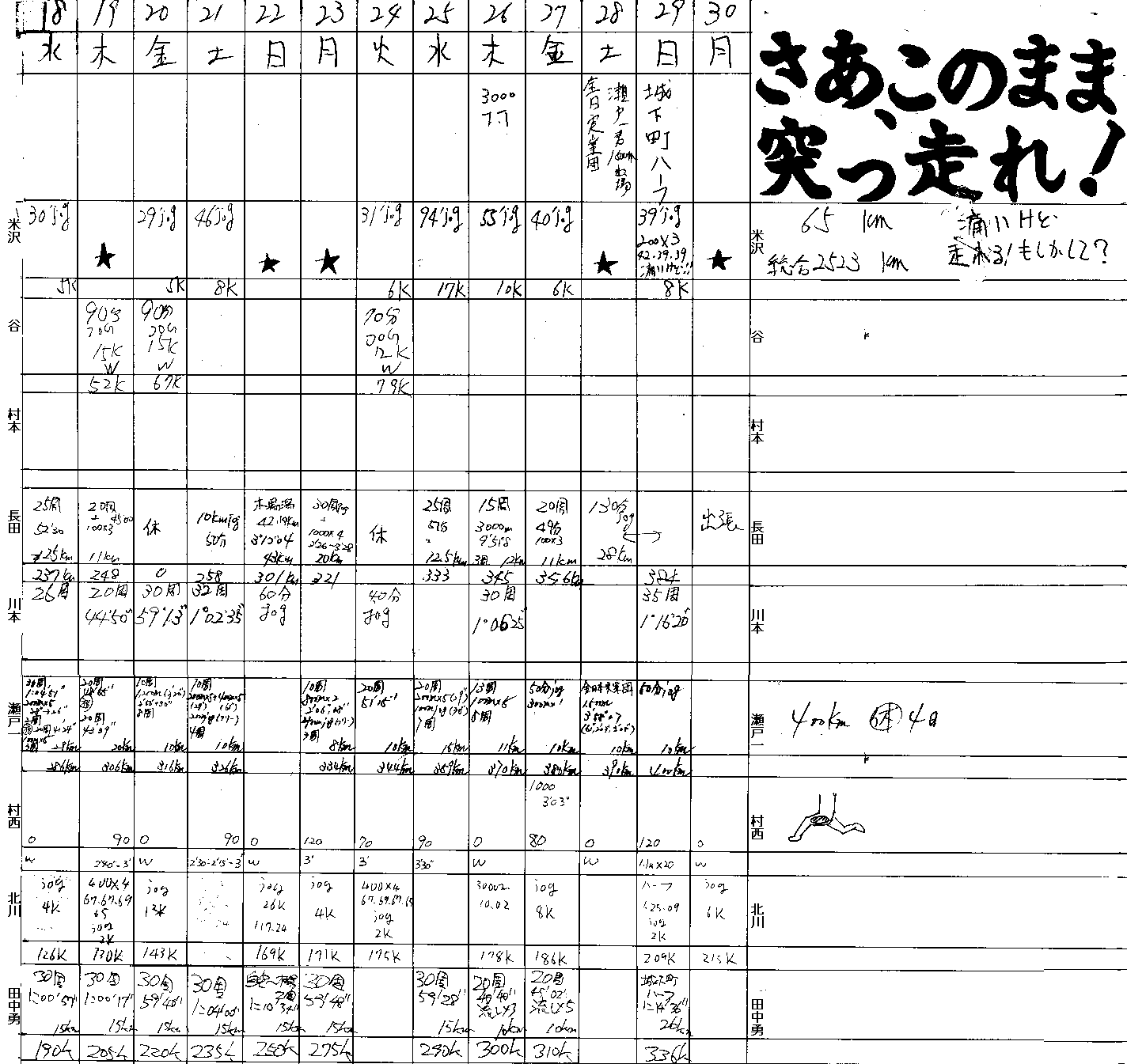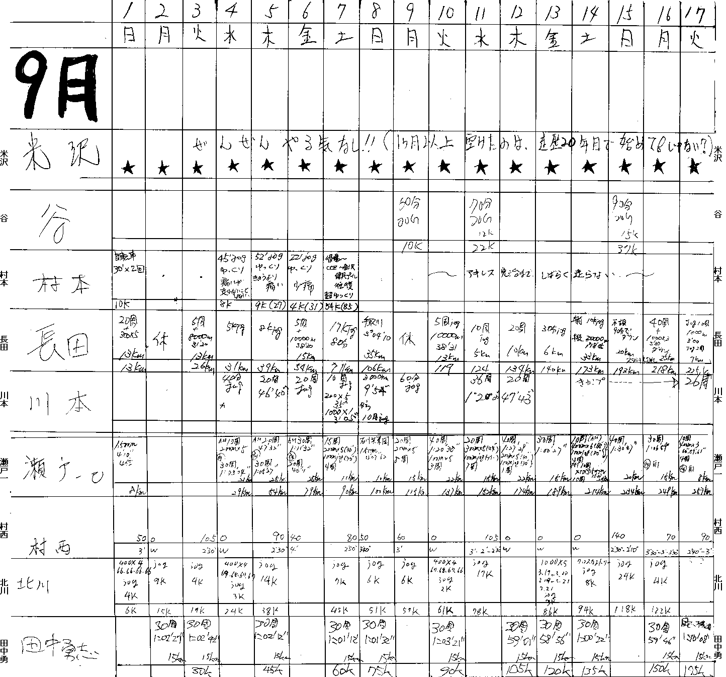 | 田中勇 | 5000 16'18.28 ハーフ 1:14'36 | 1 2'49 | 336km | |||