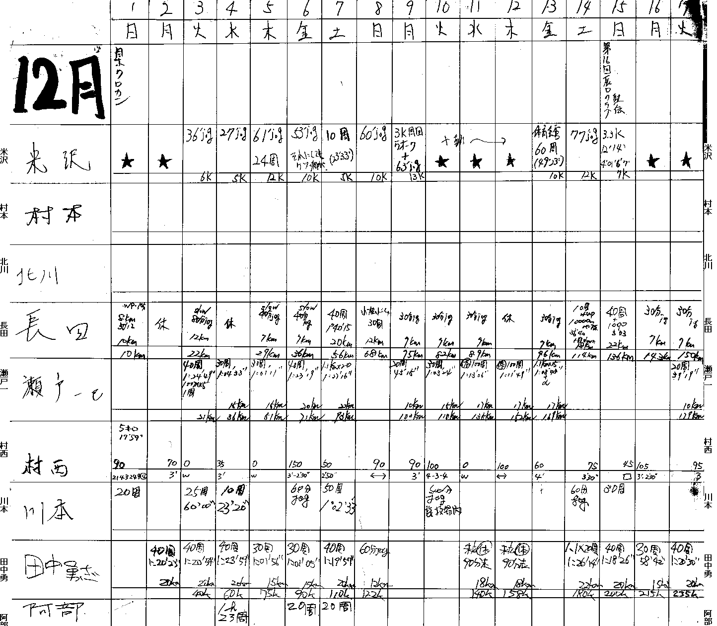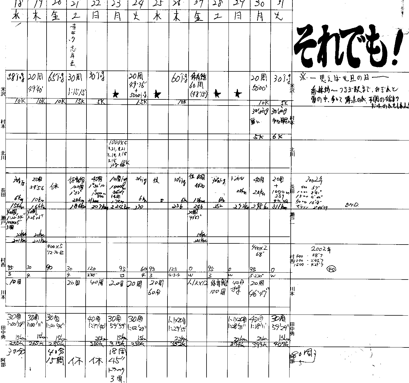 | 村西 | 5k 17'59 | 400*5 72,70,65 400*2 68 | 2002 400 58.7 1000 2'45.7 1500 4'29.7 40才になった |