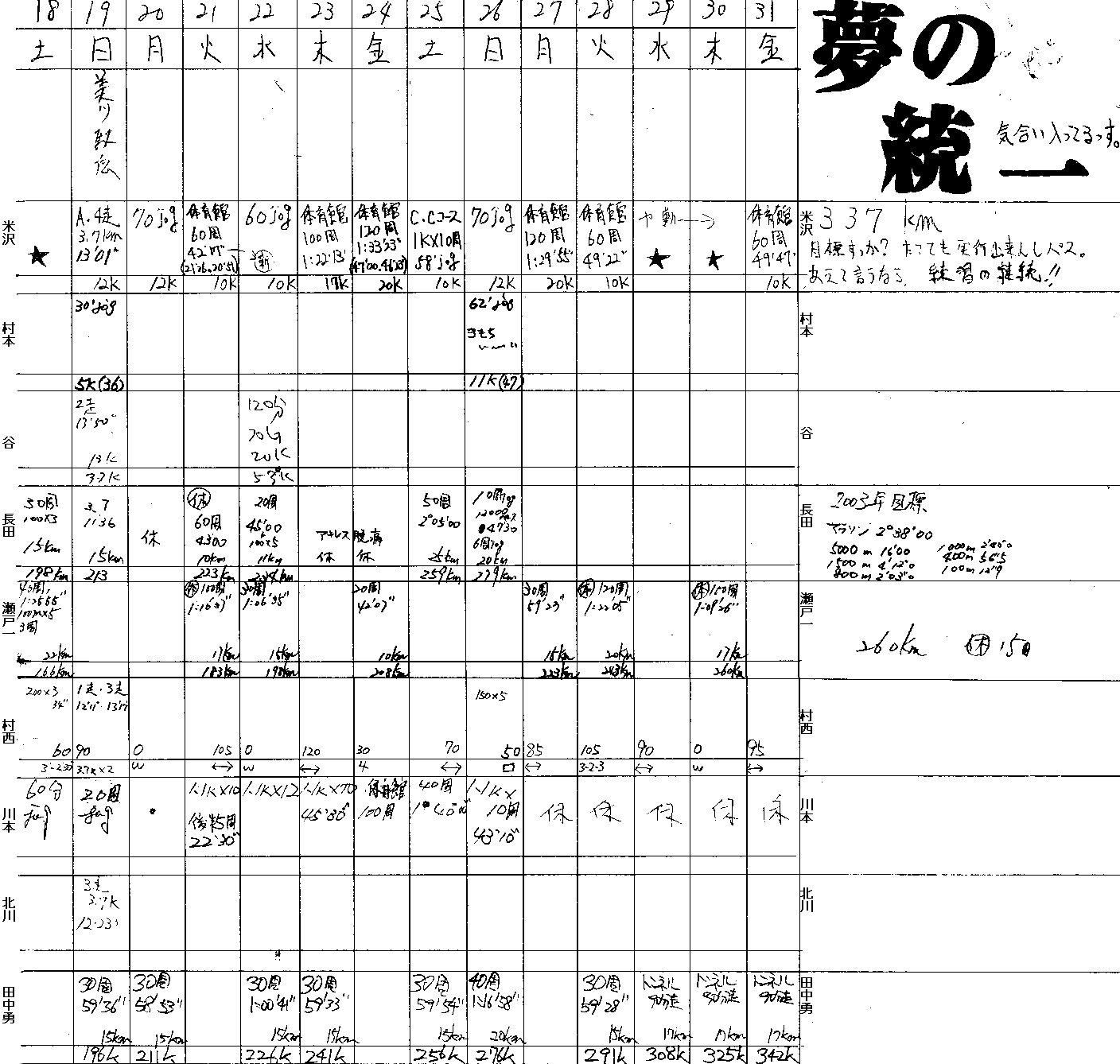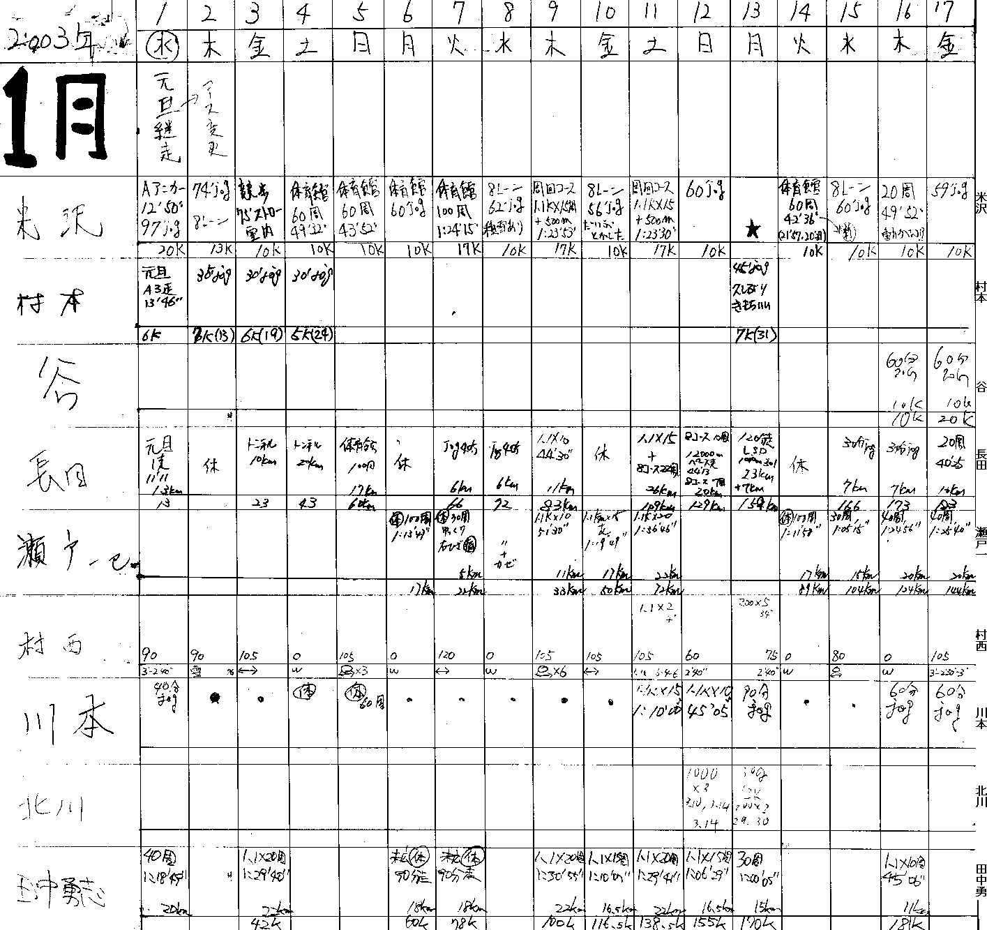 3.5 1112 3.7 1136 | 1 301 | 12 4413 12 4730 | 279km 2003年目標 マラソン 2:38'00 5000 16'00 1500 4'12 800 2'03 1000 2'40 400 56.5 100 12.9 |
