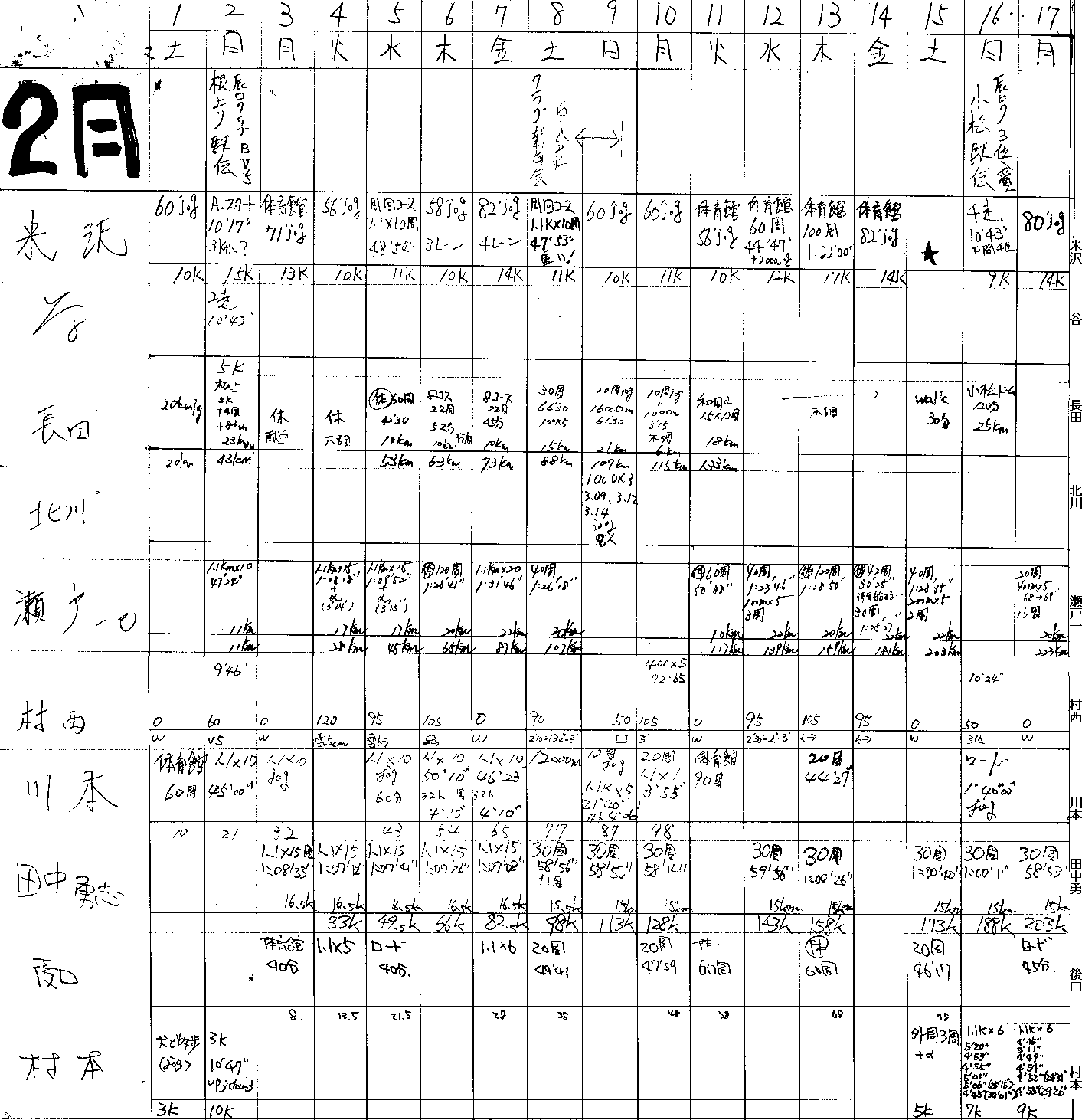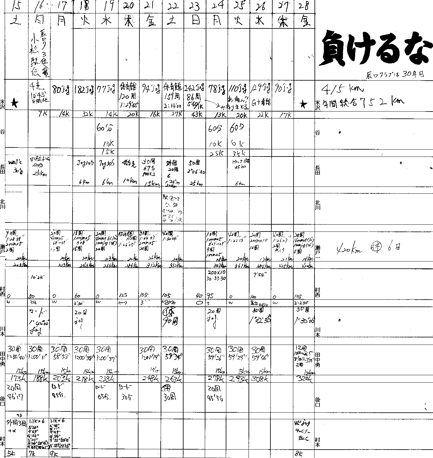 | 順位 | 選手 | 練習量 | 日平均 | 20km以上 | 備考 |