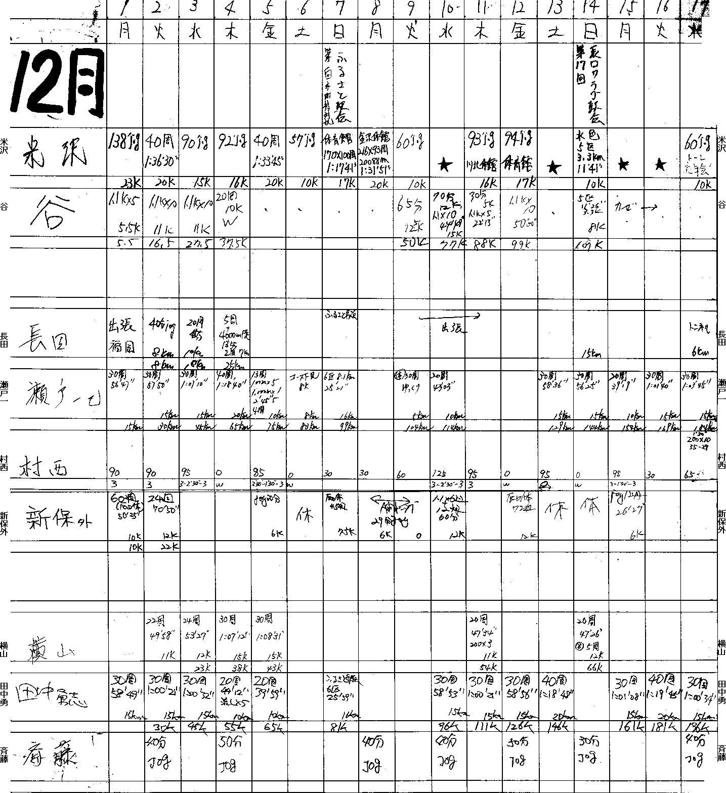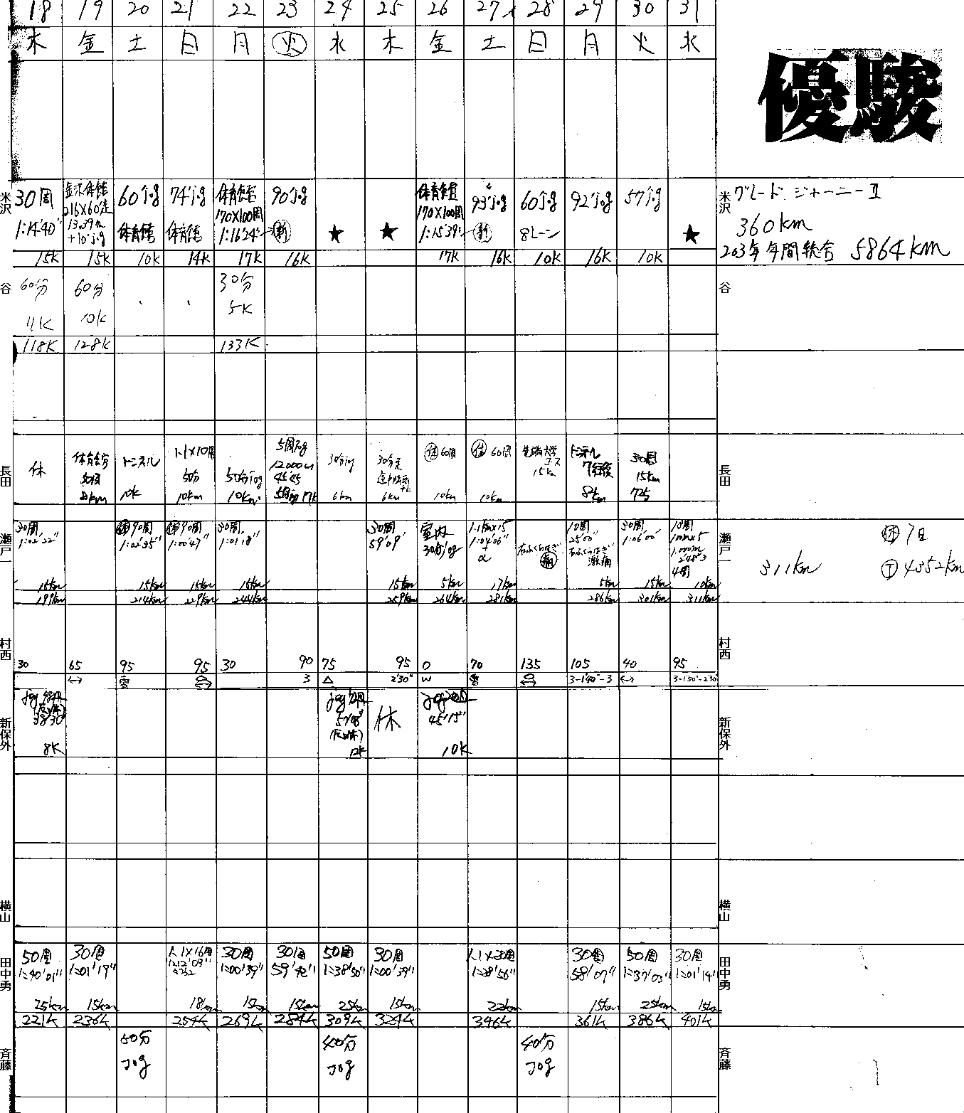 | 順位 | 選手 | 練習量 | 日平均 | 20km以上 | 備考 |