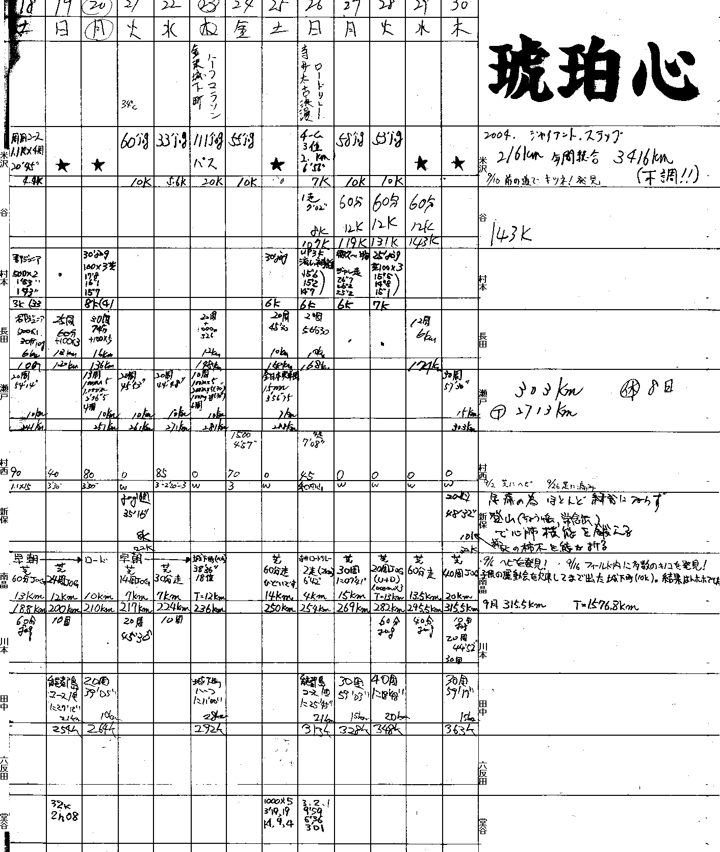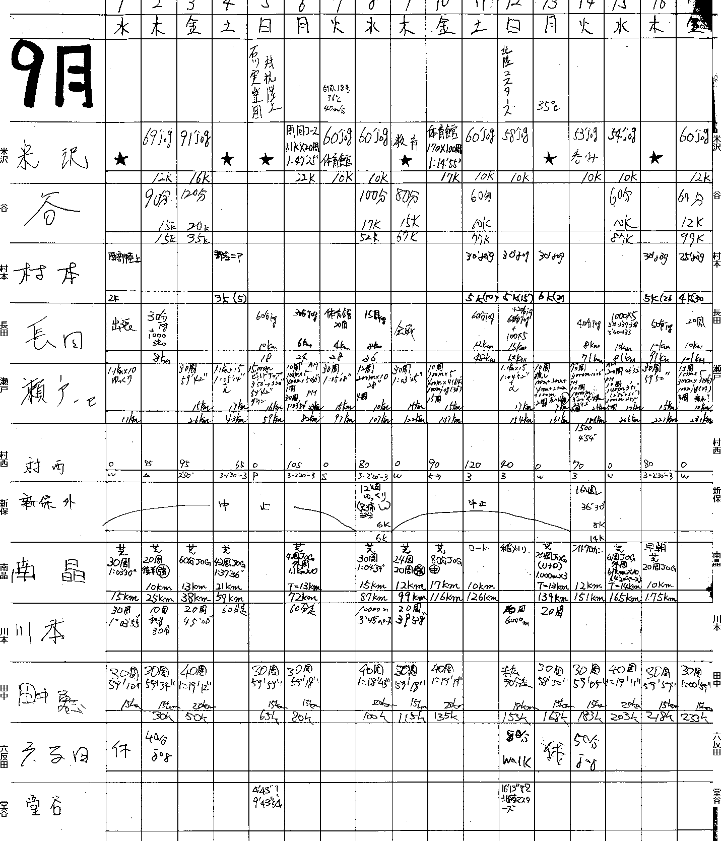| 3 | 田中勇 | 363km | 12km | 8日 | 休み9日 |