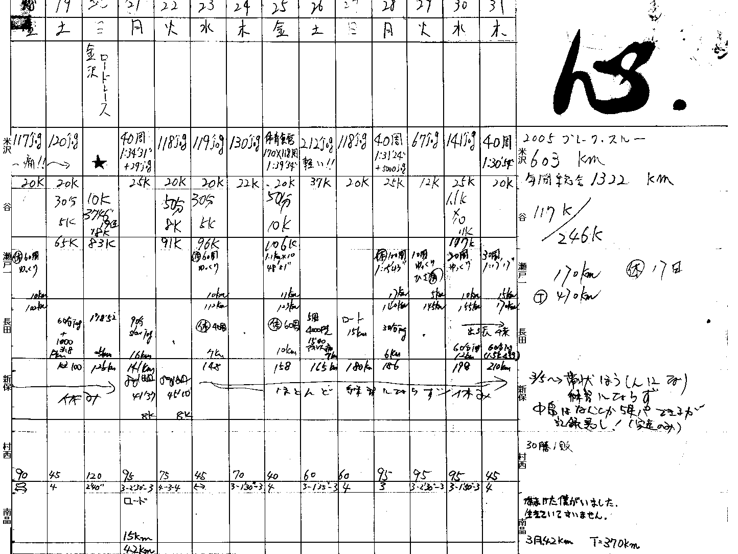 | 1 | 米沢 | 603km | 19km | 26日 | 休み2日 |