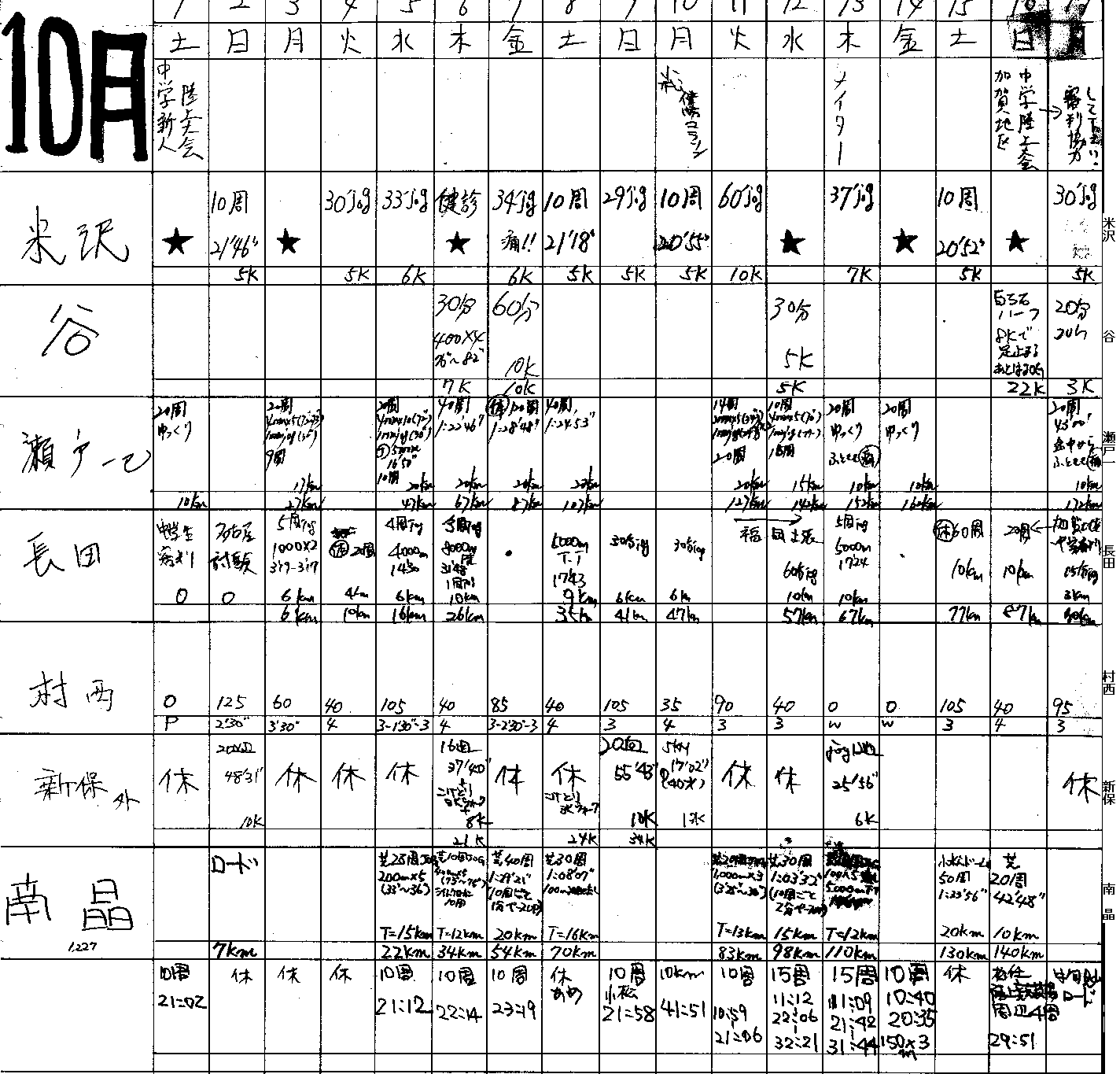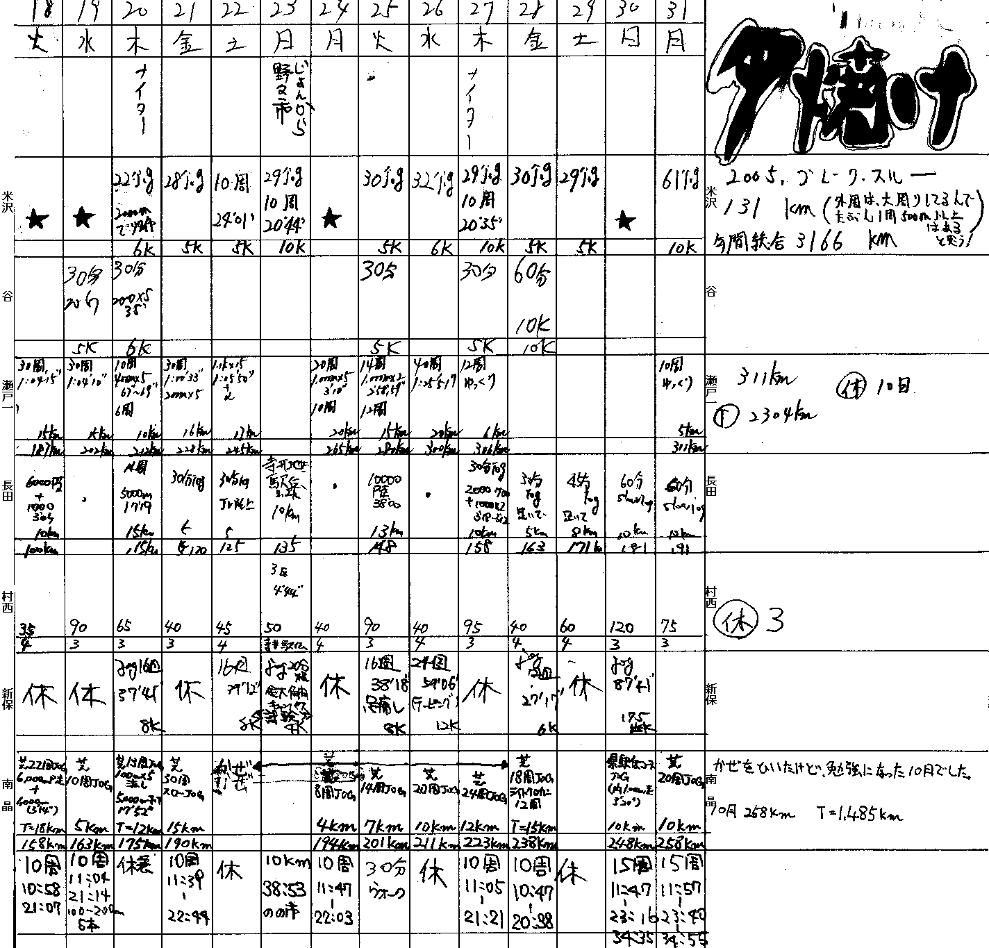 | 堂谷 | 10.3k 3524 10k 3405 10 344302 | 1 3'05.8 | 1*5 3'24,24,20,20,13平均3'20.1 | 507km トラツクシーズン終了 不完全燃焼 |