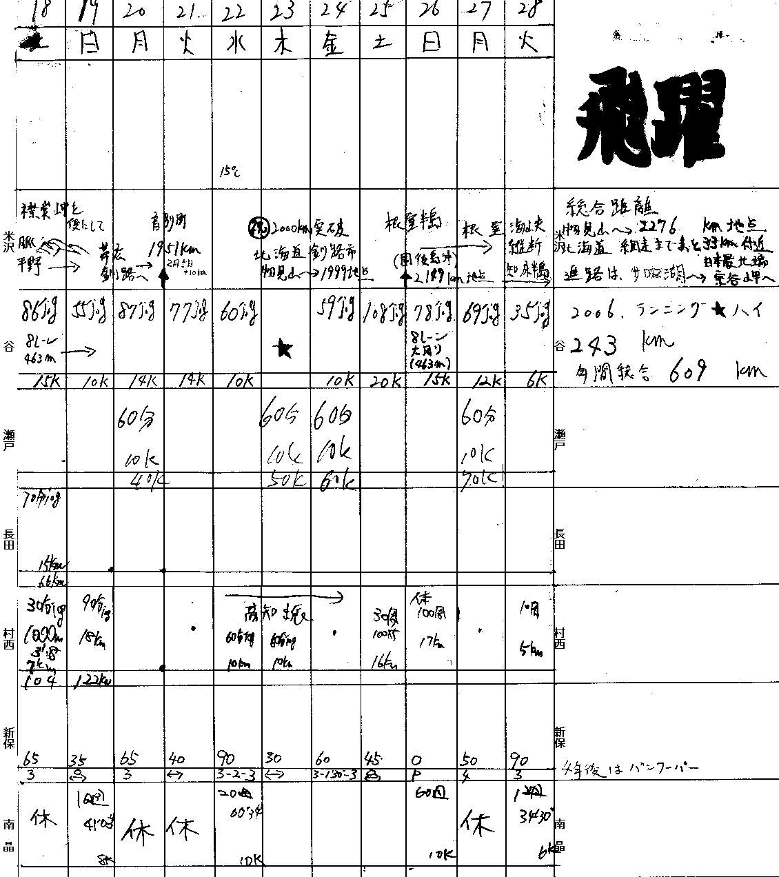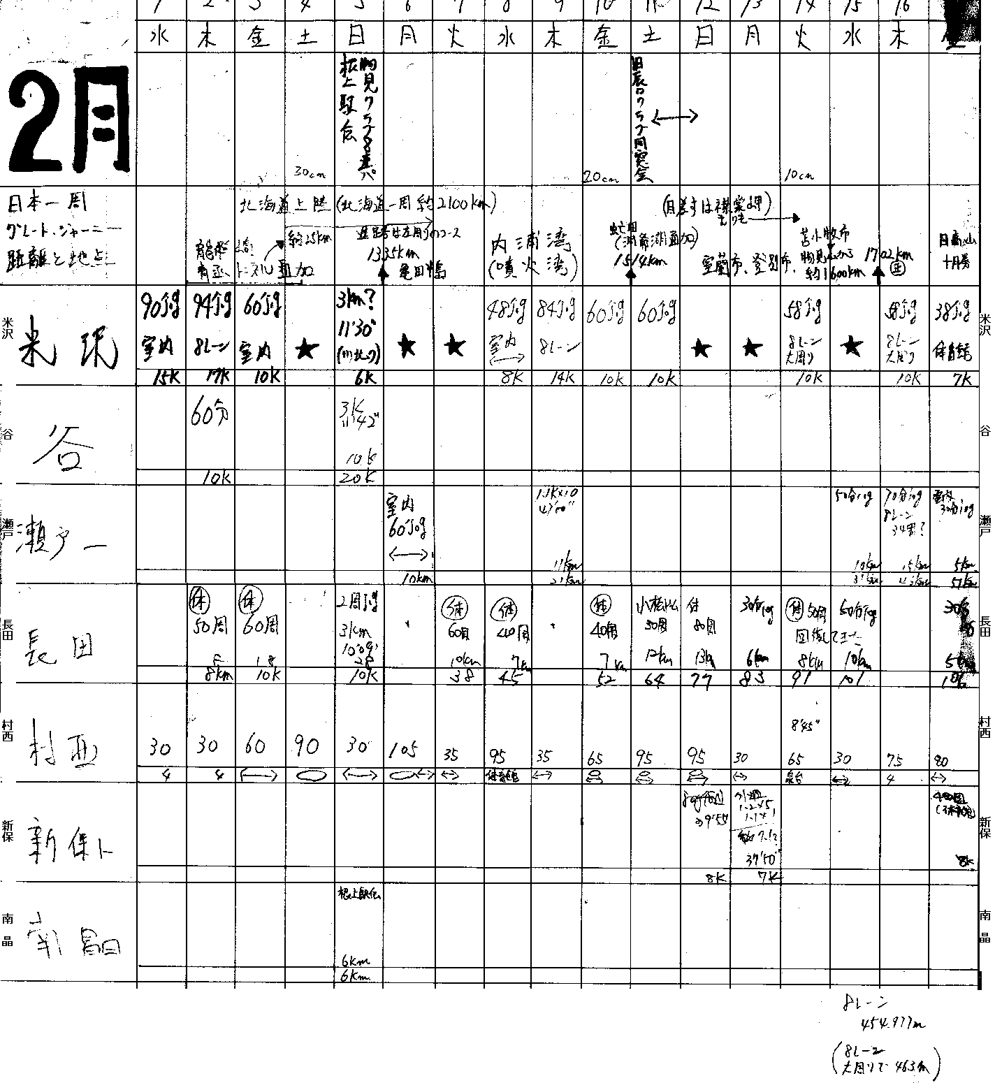 | 2 | 村西 | 1615分 | 56分 | 1日 | 距離換算323km |