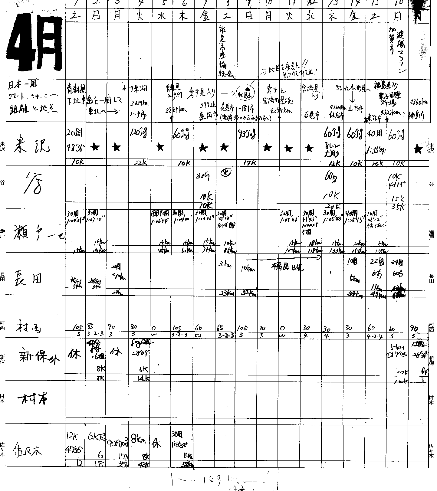 | 瀬戸一巳 | 100*5 100*5 200*5 200*5 30-31 400*10(70-72) 400*8(72-74) 100j(30s) | 1000*5 3'10 1000*2 3'00,2'57 | 330km | |||