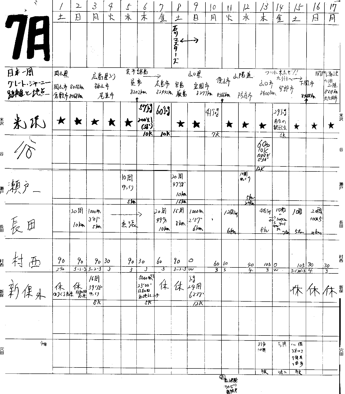 | 1 | 堂谷 | 513km | 17km | 5日 | 休み0日 |