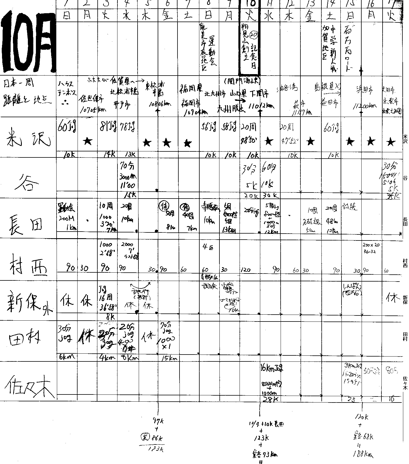 | 堂谷 | 10 33'40.45 10k 34'28 | 16000m59'55 16000m59'32 | 1000*5 3'20,22,20,19,21平均3'20.6 1000*5 3'27,21,22,24,18平均3'22.5 | 533km |