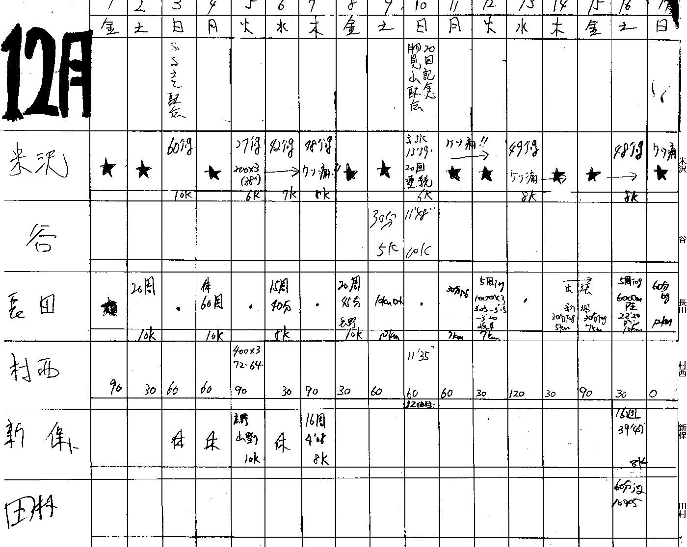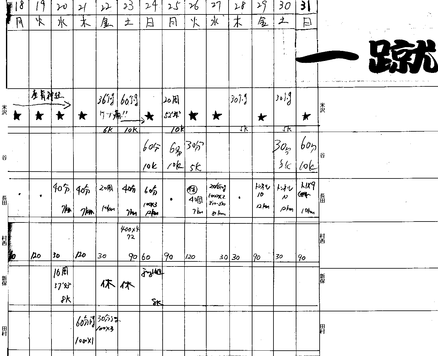 | 順位 | 選手 | 練習量 | 日平均 | 20km以上 | 備考 |