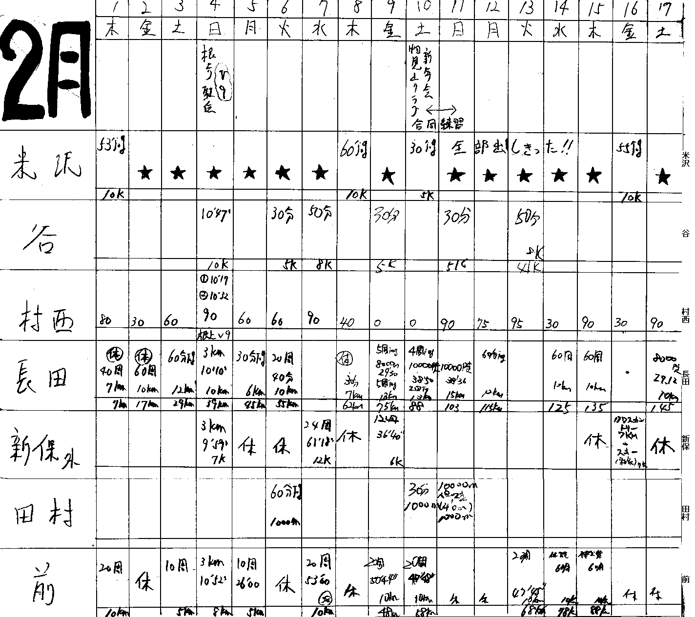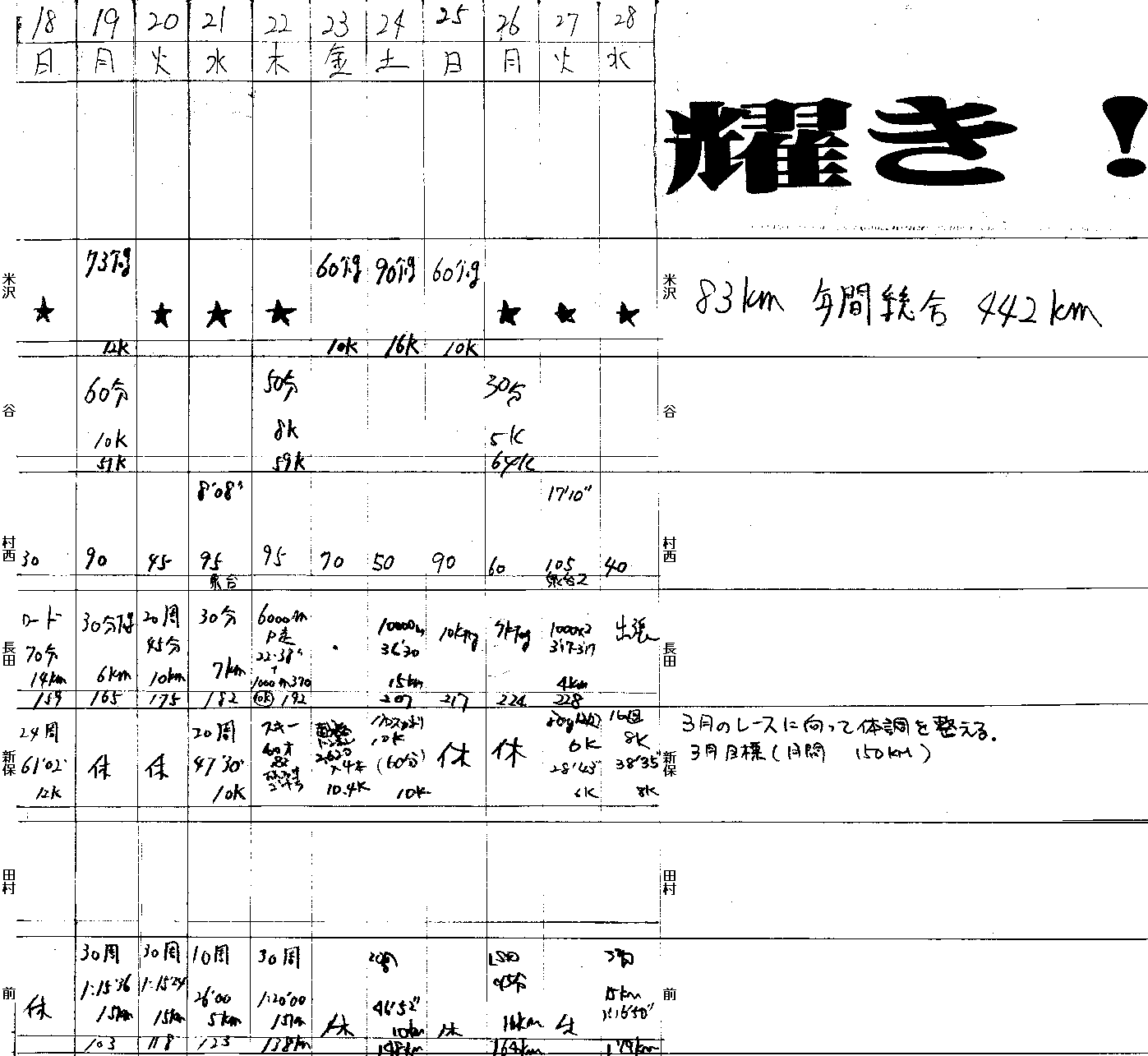 | 順位 | 選手 | 練習量 | 日平均 | 20km以上 | 備考 |
